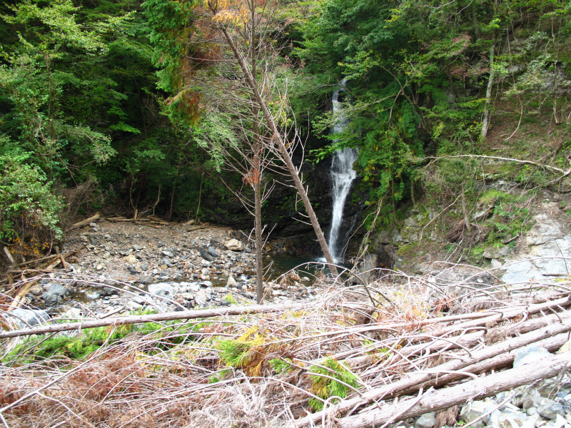 今日はヌタハラ谷を出合からつめることにする。左岸の杣道を使いゴルジュを巻く。谷に入ると右岸の穴から湧水が流れ落ちていた。沢装束ではないので、滝が出てくるごとに巻いていかなければならない。始末の悪いのは植林地も山抜けで寸断されており谷に降りたり上り返したりと効率が悪い。8m滝は右岸から巻きすだれ状の二段滝は左岸から巻いた。その後は基本的に左岸を使いながら歩くと、左岸の大規模な崩落で谷が明るくなった。林道近くの崩落が谷まで到達しており、崩落の先端すら見えない程の大規模なものだった。押し流された土砂や木を越えると夫婦滝の下段が見え、木の陰から上段の滝も見える。崩落は夫婦滝まで押し寄せている。それにしてもここまで2時間か、時間がかかる。