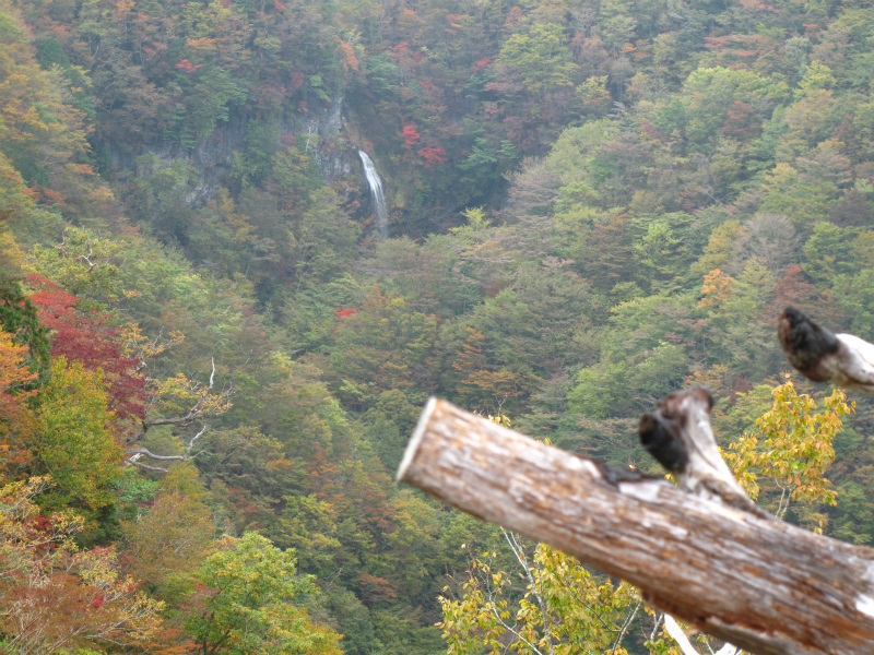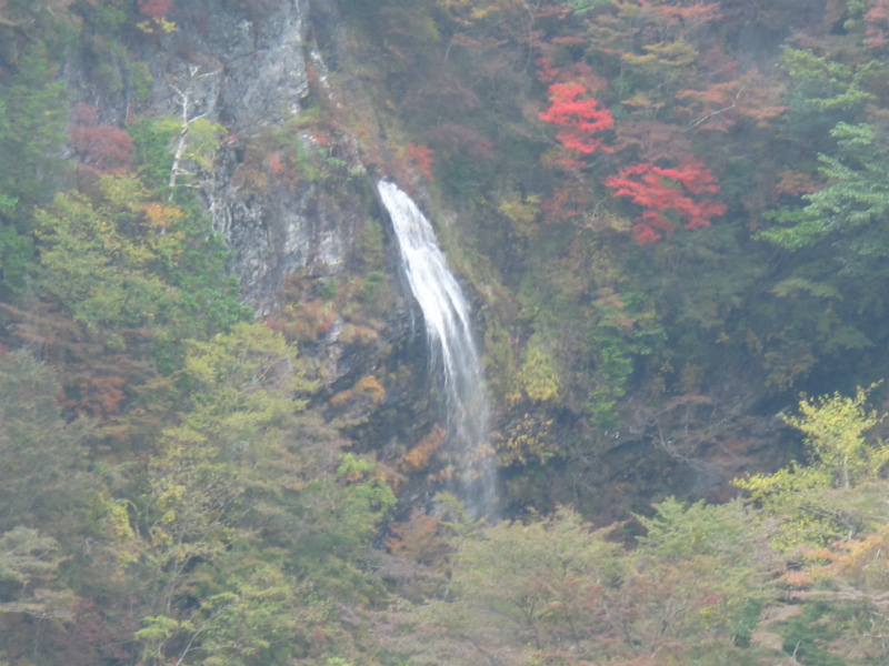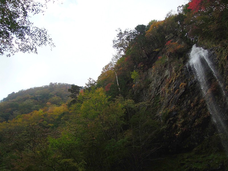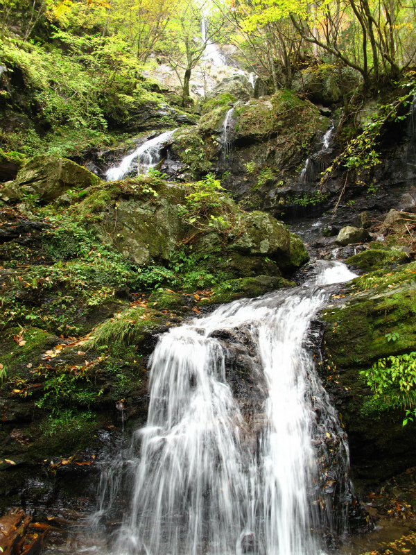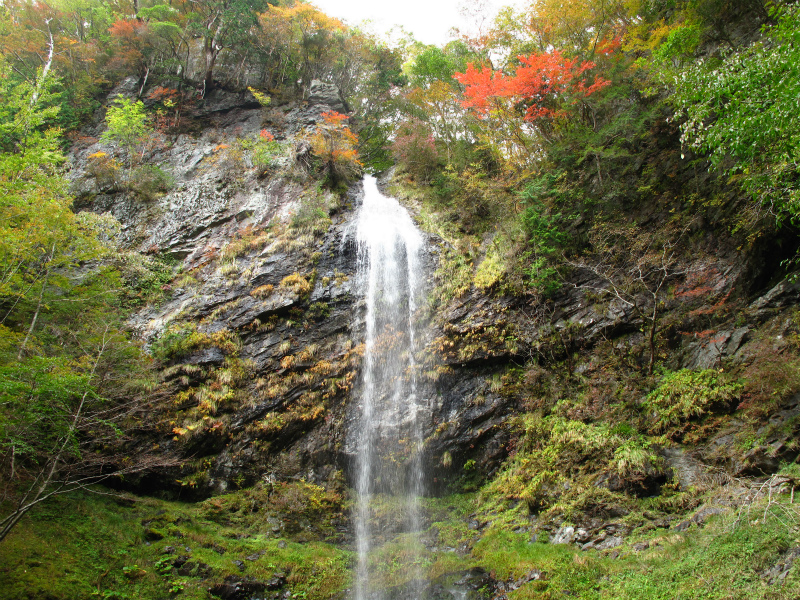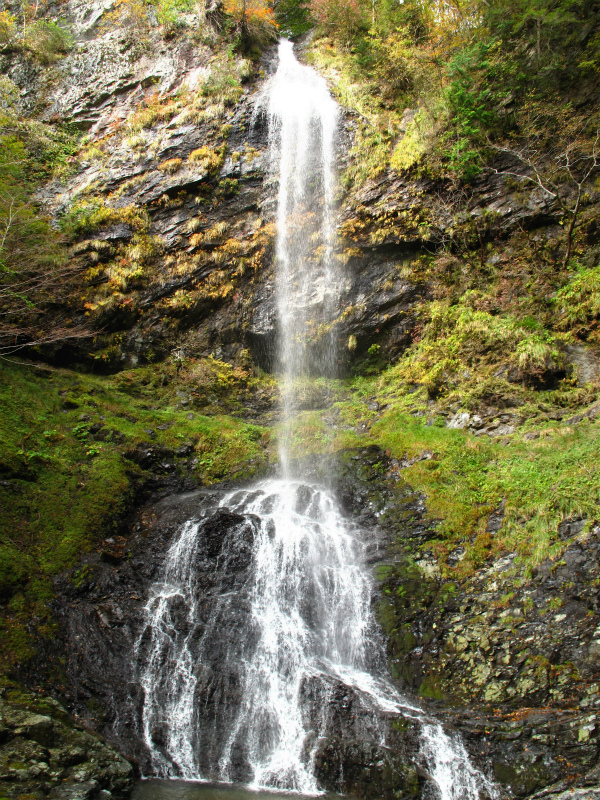 滝上部の紅葉や岩壁の草も色づきはじめている。この滝は狭い滝口から落ち上部で広がりすだれ状に40m落ちている。そして、下部の岩に当たって分岐瀑となり見どころの多い滝だ。