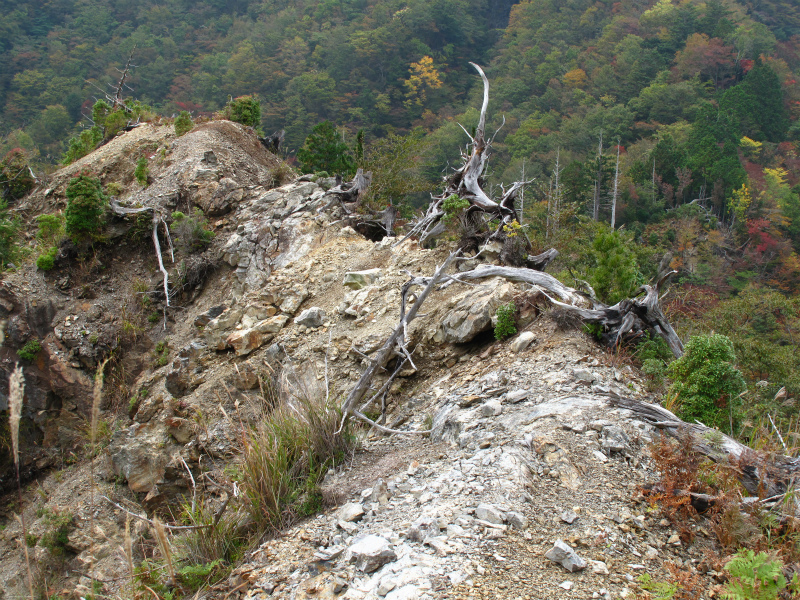 火事場跡に出る。ここを下るのは三回目だが、いつ来ても緊張する。土砂が流れ落ちて岩がむき出しになってきている。もろい岩なので注意が必要だ。一か所なにも手掛かりがなく慎重に歩いていくしかない所がある。人の歩いている所なので確実に進めば問題は無いが、ここで強風に吹かれるのだけは勘弁してもらいたいものだ。三度目なので慣れてきても良さそうなものだが、慣れ具合と崩壊具合がちょうどいい感じでバランスをとっていてそれを許してくれない。後は植林に入り下るだけで、ここからは再びマーキングが現れる。