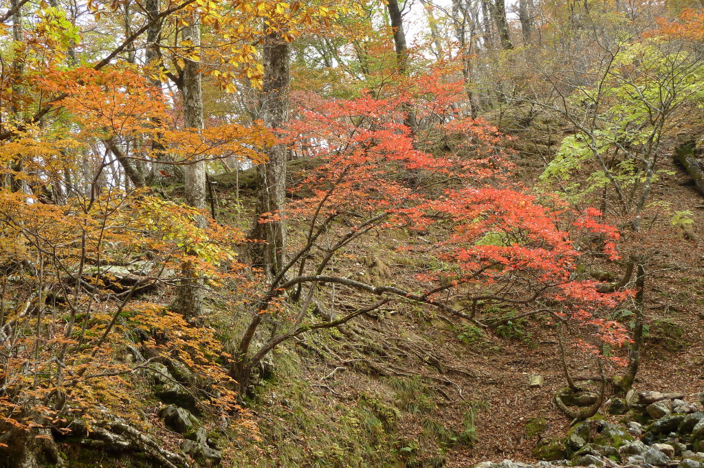1100mと1150mの二俣を見送って右岸を巻き源流二段滝に着いた。この滝は奥行きがあるわりには背後は明るく開けているので印象深い滝だ。ここは岩尾根を使って右岸を巻く。踏み跡をたどっていくと小尾根に出た。小尾根の上部はきれいに色づいている。トラバースするには上りすぎだが、トラバースし直す気にもなれずそのまま上っていくといい感じになってきた。なかなか経験者のグーさんのようにしっかり辿れないなあ。