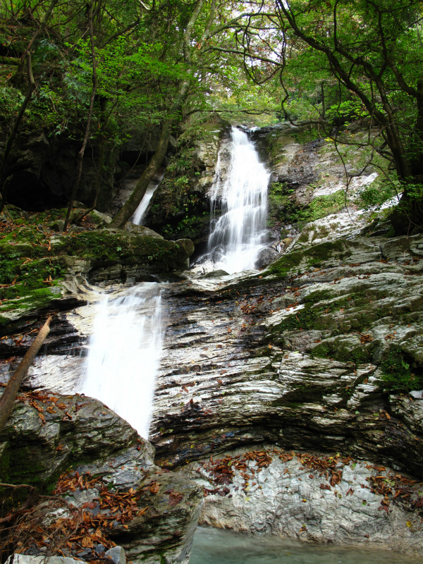 この滝は狭い滝口から落ち上部で広がりすだれ状に40m落ちている。そして、下部の岩に当たって分岐瀑となり見どころの多い滝だ。
