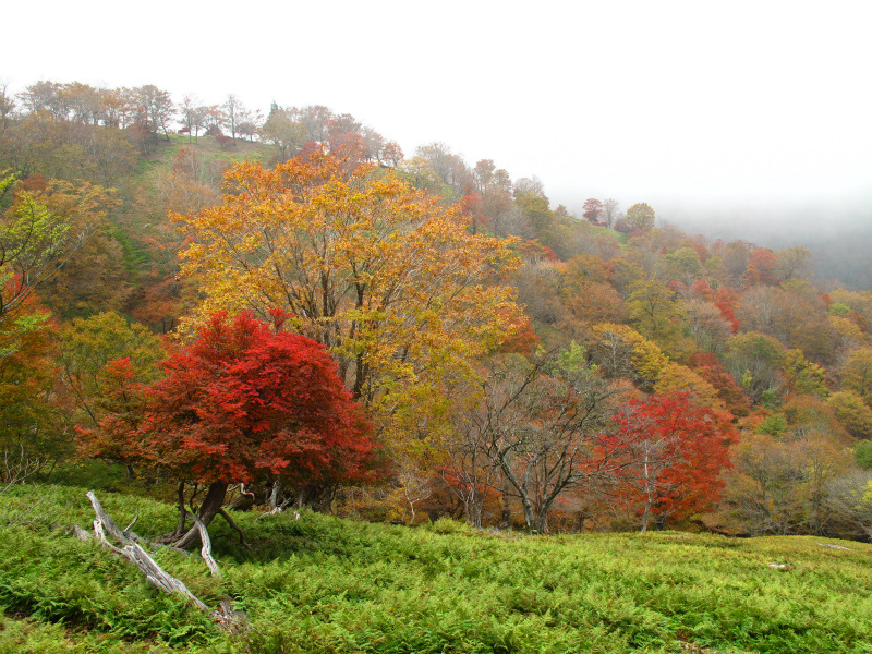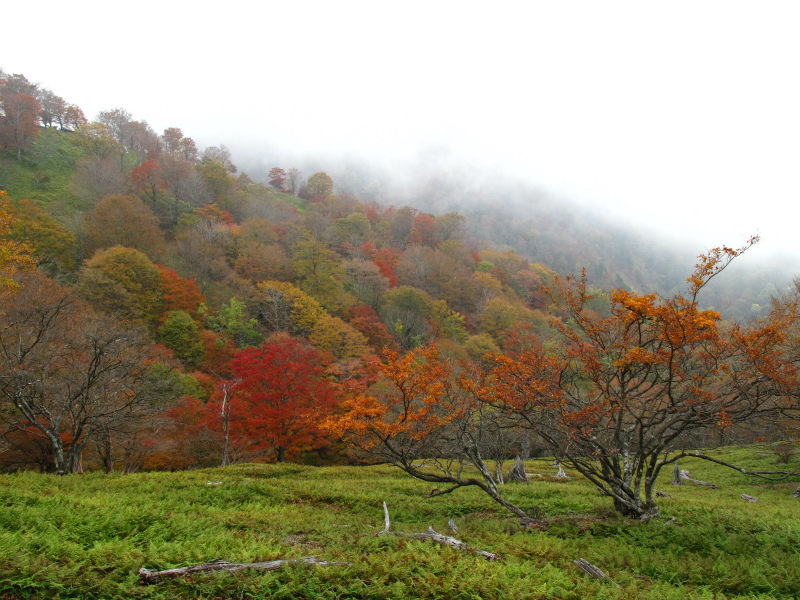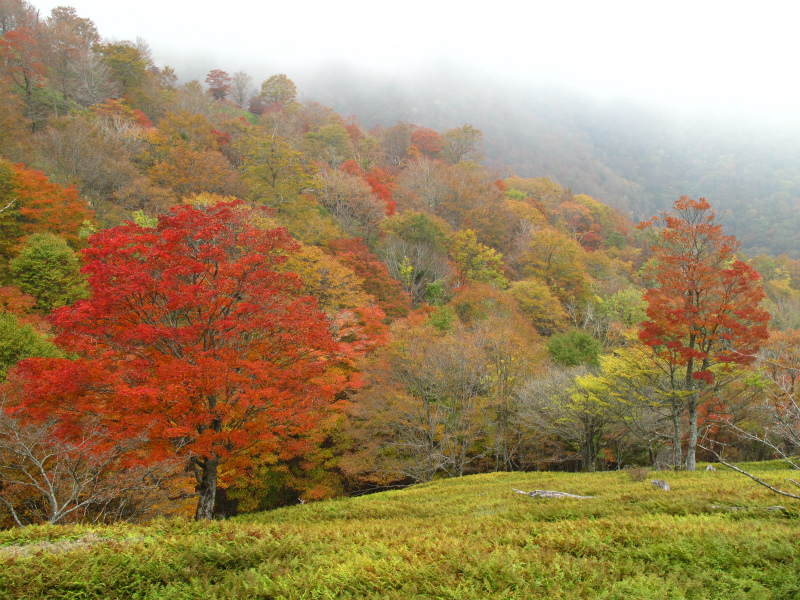 色づいた尾根を上っていくとヒキウス平対岸の第三劇場に着いた。ガスがかかっていて桧塚奥峰は見えないがヒキウス平の紅葉もきれいだ。ガスで背景が見えない分、ヒキウス平から第三劇場にかけての紅葉に緑の草原が際立って美しい。動く気にもなれず自然の造形美に身をゆだねる。ヒキウス平も散策しようかとも思ったが、このすばらしい景色が見られれば充分。
