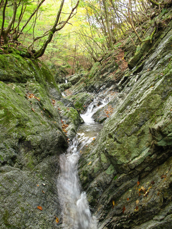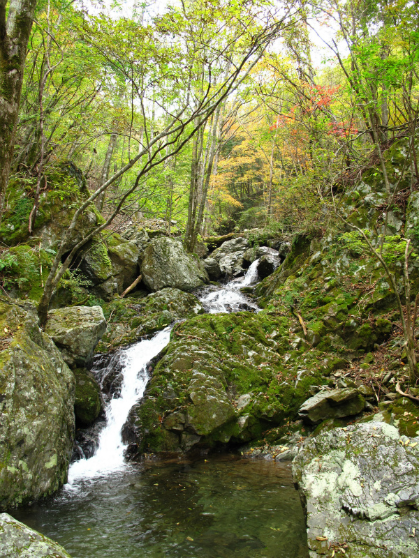 ゴーロの谷を上って行くと、見たことのある大岩が。小滝をいくつか越えると行き詰った。前回来た時と同じく、左岸の小尾根を上りトラバースしていくと不動滝に到着。滝上部の紅葉や岩壁の草も色づきはじめている。この滝は狭い滝口から落ち上部で広がりすだれ状に40m落ちている。そして、下部の岩に当たって分岐瀑となり見どころの多い滝だ。