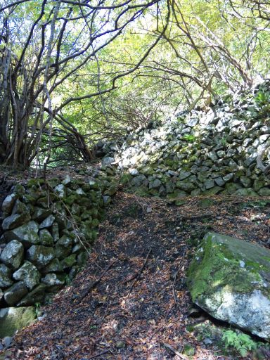 最初の小滝は左岸を巻く、さらに2つ目の六ショウ滝と思われる滝を越えると仙右衛門敷と言われる立派な石垣が現れる。