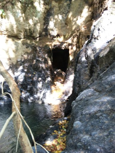 ここを過ぎてすぐ右手にも坑口の水抜きのような四角い穴が目に入った。ここも前回は見逃していた。左岸の谷の水を緑青滝に流す水路があったので、その一部かな?