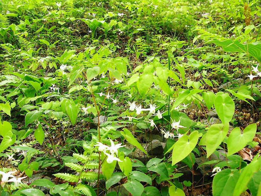 今日は観音岳には寄らず日川峠に下る、途中で尾根を間違ったのか早く降りてしまい日川峠は通らず植林地を谷に下る。地形図には岩内の瑞巌寺から日川峠を通り与原に至る破線道がのっているがその道を辿りたかったが地図を持って来なかったので適当に与原を目指す事に。日川の里も平家の落人の隠れ里と言う事で「平家隠れ洞窟」の案内板があった。植林の谷を上がって行くと明らかなかつての木馬道がスピードが出過ぎないようにカーブを描きながら尾根を上がって行く、途中で水平道になりそれはいくつかの尾根谷を巻き長く続いた、もしかしてこれが破線道かもしれないと思った。(あとで確認したら途中から破線道に合流でした)、やがて谷を下る、砂防のうえにはワサビが群生、すこしかじるとカラ~イ!、でも根っこ大きくないなぁ。