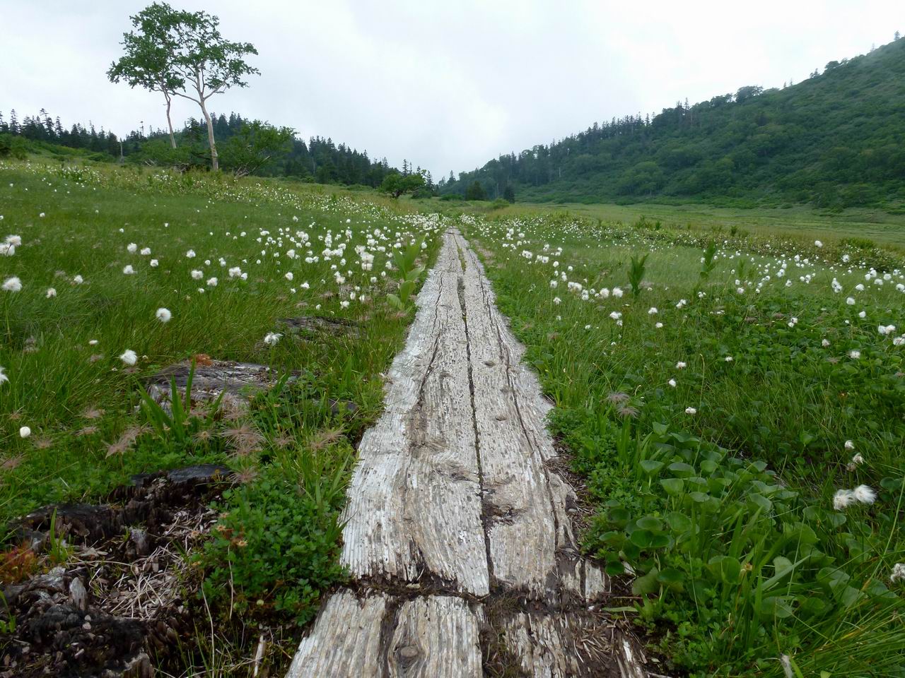 黒沢池の左手に木道の道が続いており、ここはワタスゲが白い穂を揺らして出迎えてくれた。黒沢池から流れ出る尻沢に架かる小
