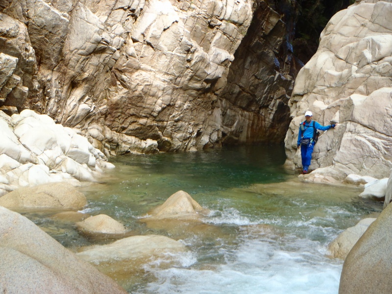 白滝谷出合の砂地で小休止して、大岩をいくつか乗り越えるとすぐにプールに出会う。