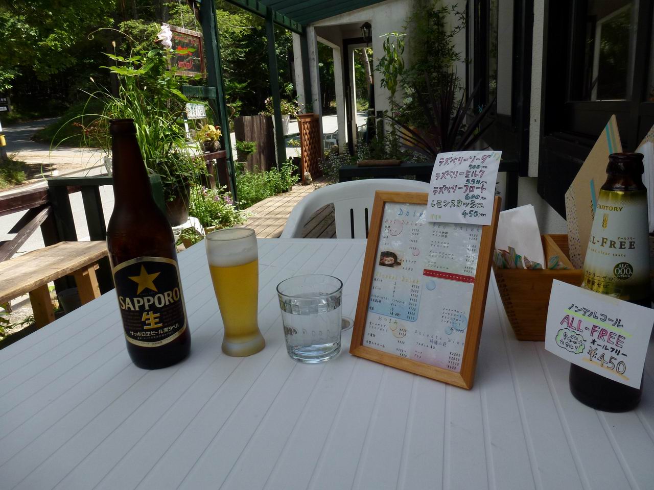 進むと、昨日横切った場所に戻ってきたため、ここからは再び登山道に入り、瑞牆山荘に到着した(12:20)。瑞牆山荘のカフェテラスでビールと枝豆を注文し、2日間の山行を振