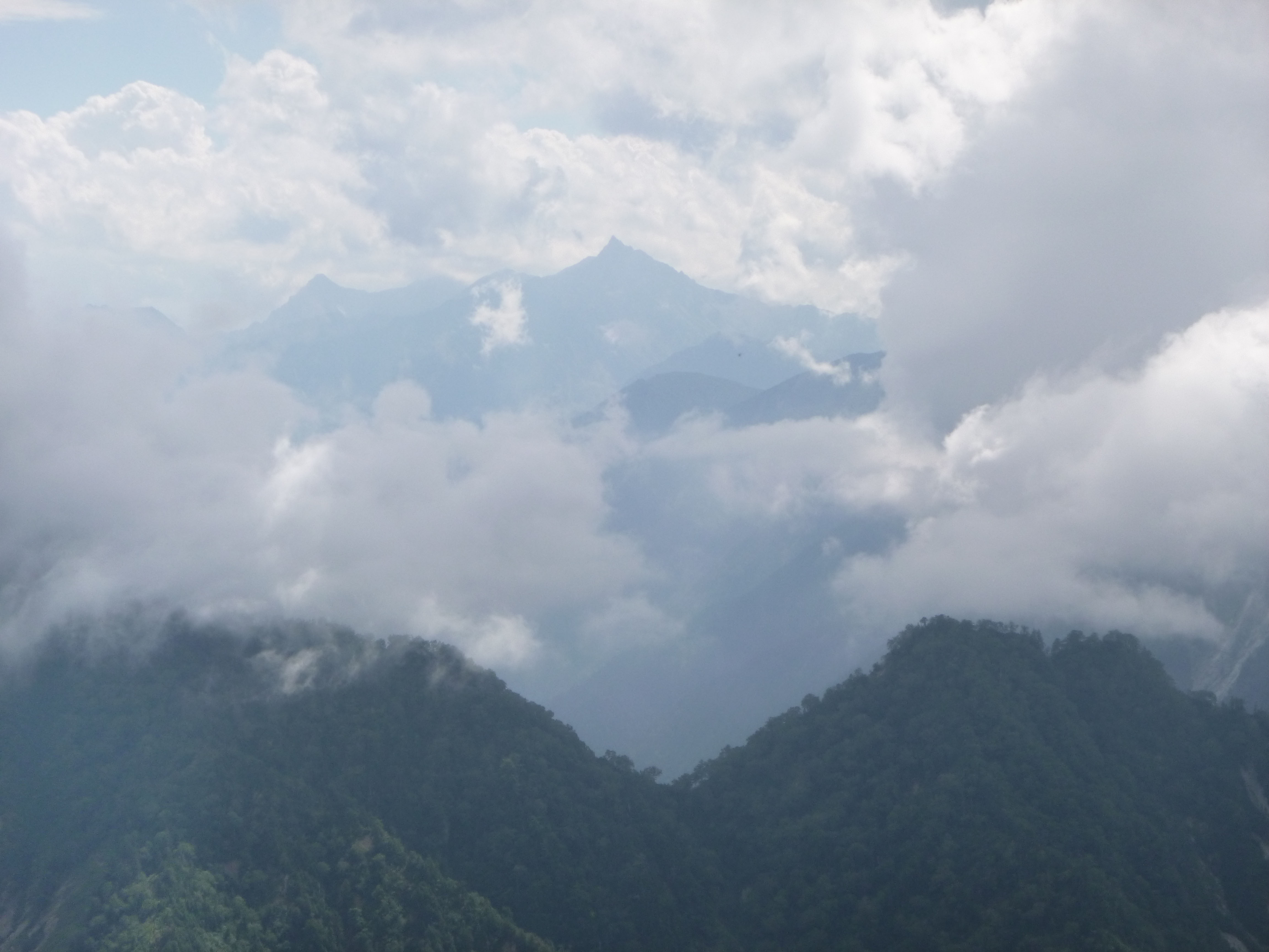 雲の切れ間から顔をのぞかせる槍ヶ岳