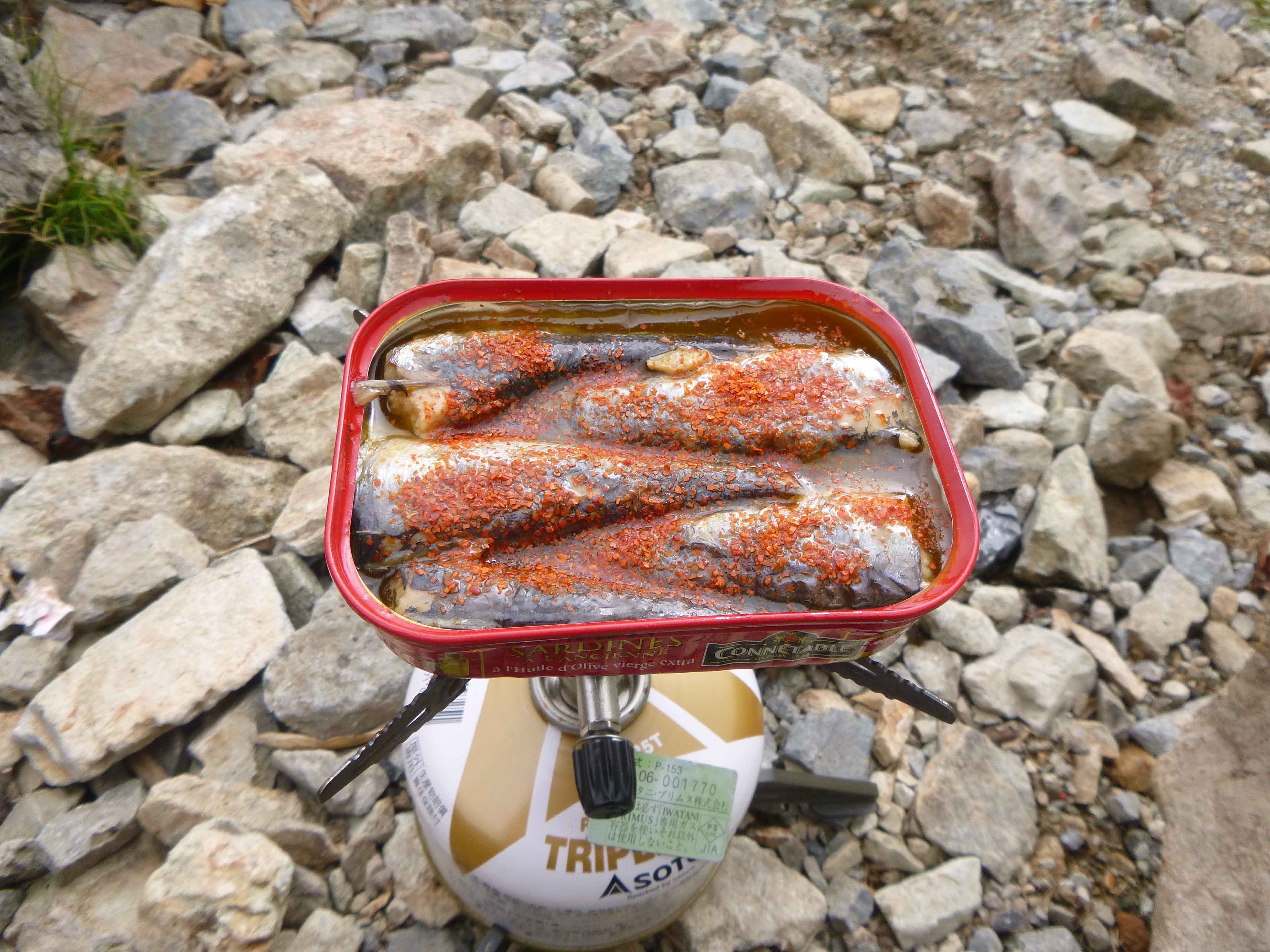 さあ,これからはお待ちかね,まったりゴールデンタイムだ.ビールのおつまみは,マルヤスで買ってきたオイルサーディン.缶を開け,コンロでそのまま加熱したあと,唐辛子をたっぷりと振りかけて食べる.これがうまいんだ~.プファ~,なんとも至福の時間.雲の切れ間から,遠くに槍ヶ岳が時折姿をのぞかせる.