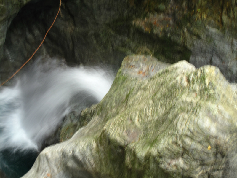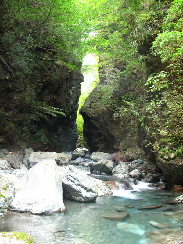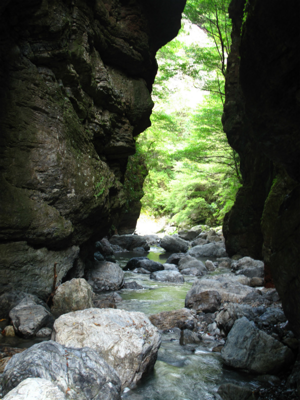 この道は行合の手前まで続いていた。両岸の壁が急激に接近した行合を通る。途中までは長靴でどうにか行けたのだが、1週間前の台風の影響で水量が多い。しかたなく長靴を脱いで歩く。