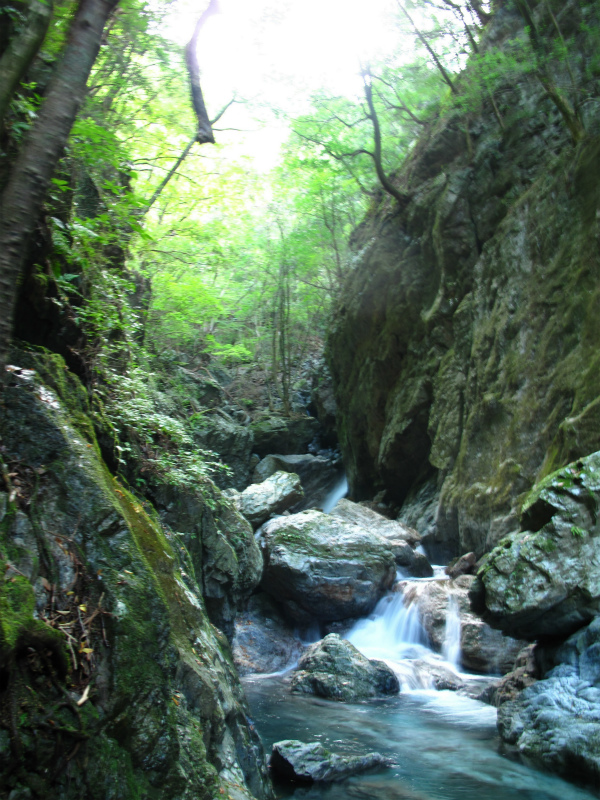 江馬小屋谷に入ると右岸に登山道の黄色テープがあり、たどっていくとトラロープもあるが下部は抜け落ちている。さすが台高の登山道はワイルドだぜ。この道は行合の手前まで続いていた。両岸の壁が急激に接近した行合を通る。途中までは長靴でどうにか行けたのだが、1週間前の台風の影響で水量が多い。しかたなく長靴を脱いで歩く。この時期なので、水温もいい感じで、清流の岩も足にフィットして気持ちがいい。天上の岩壁のすきまから見える緑がまぶしい。長靴をはこうとすると細長くのびたヒルがついている。今、上がったところなのに、ヒルって水の中にもいるんだ。