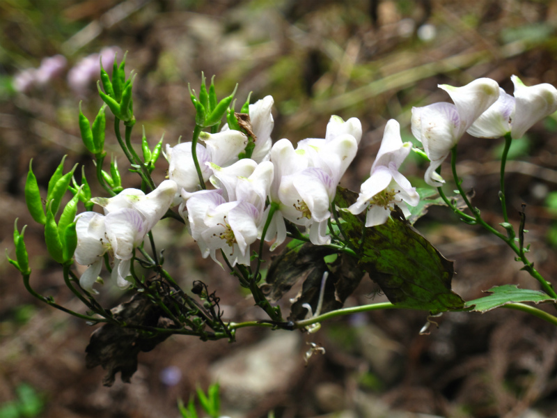 その先には、白いトリカブトがたくさん咲いていた。再び自然林の尾根に入り下っていくとシカのシャレコウベが置かれた登山口だった。