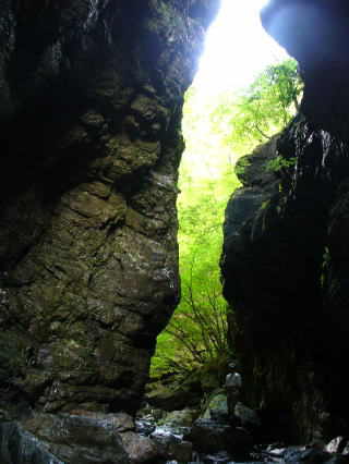 この時期なので、水温もいい感じで、清流の岩も足にフィットして気持ちがいい。天上の岩壁のすきまから見える緑がまぶしい。長靴をはこうとすると細長くのびたヒルがついている。今、上がったところなのに、ヒルって水の中にもいるんだ。