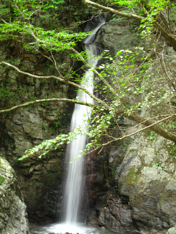 左股左岸の道を歩くと、白糸滝に出会う。下からは下段の12mの滝しか見えない。