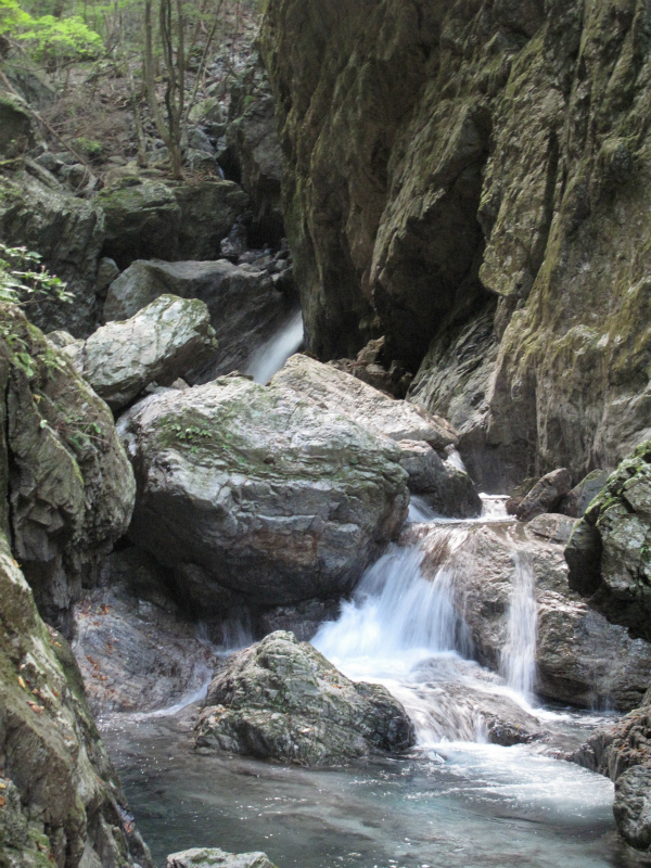 五所ヶ滝の巻道にもどり道をたどる。ここは、これまでと違い現役で使われているだけにしっかりしている。五所ヶ滝のゴルジュに沿うようにつけられており、杣道はもっと上を通っているようだ。気を使ったのはバンセンが放置されている場所に上る時で、体を持ち上げて登る所があった。ここからはゴルジュ上段の滝が岩にスラローム状に吸い込まれていくのが望めた。少し行くと杣道が右から合流し、谷が開け穏やかな谷になって二股の窯跡に到着。左股は大岩の間から水が流れ日本庭園のようだった。