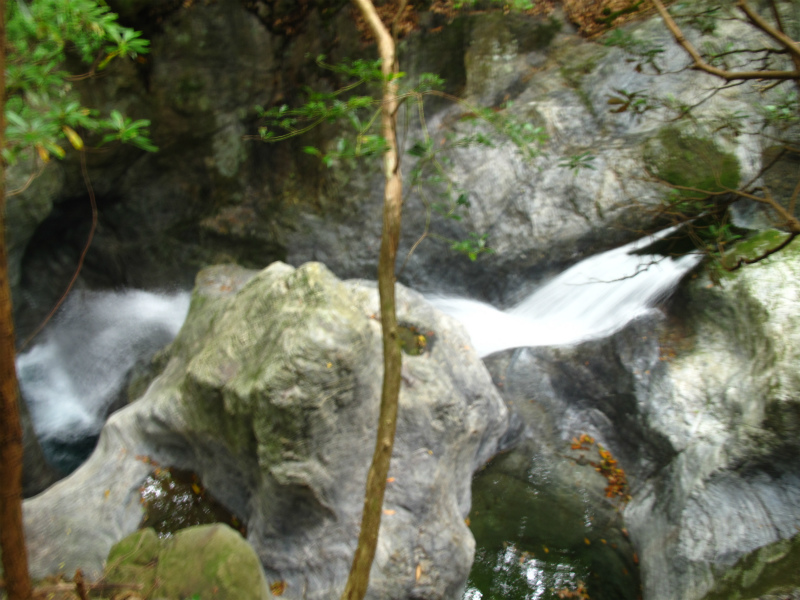 行合を過ぎて左岸の植林にとりつき昔の杣道を歩く。この道は炭窯跡をつなぐようにつけられている。道をおっていくと対岸に観音滝が見える崖で行き詰った。岩崖を登った所にマーキングがあるとZIPPさんが書いていたので、上っていくとあった。体をぐいっと持ち上げて崖を上ると、崖にそってマーキングがていねいにつけられており岩崖を通過。へ~,こんな所に道があるんですか