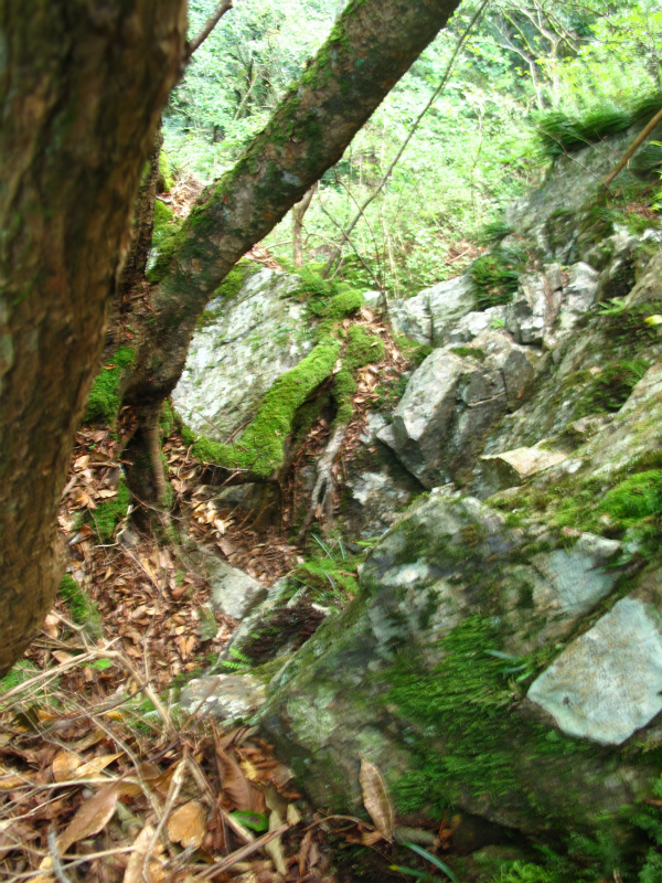 行合を過ぎて左岸の植林にとりつき昔の杣道を歩く。この道は炭窯跡をつなぐようにつけられている。道をおっていくと対岸に観音滝が見える崖で行き詰った。岩崖を登った所にマーキングがあるとZIPPさんが書いていたので、上っていくとあった。体をぐいっと持ち上げて崖を上ると、崖にそってマーキングがていねいにつけられており岩崖を通過。