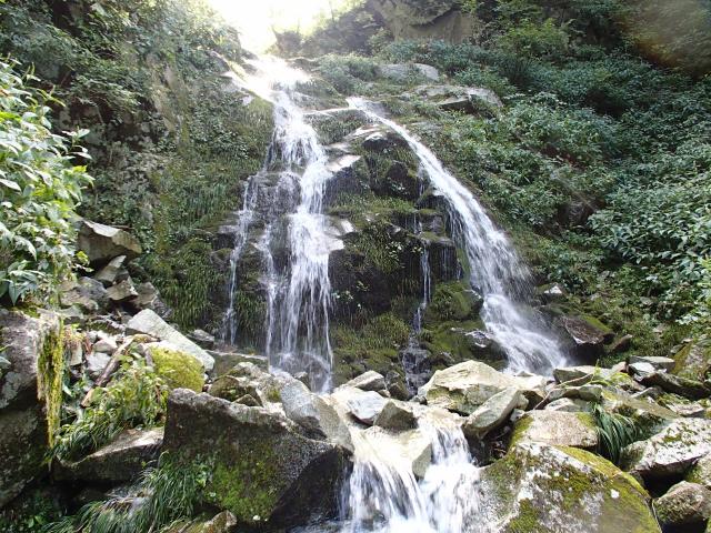 その奥には4mほどの滝を従えて16mの大滝。岩肌が滑ってそうだがホールド、スタンスともしっかりしている。濡れたくないなあと思いながら流身の右に取り付いた。途中水流の方へ追いやられシャワー状態。しばし耐えて上部のテラスに出てからは思ったより簡単に登れた。とっちゃんにはロープを出すつもりだったが最近あまりやってないロープワークにアタフタしているうちに半分位登っていた。
