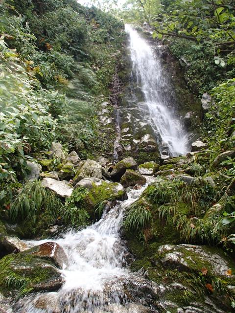 上の小滝を越えてすぐに垂瀑が見えた。思わず「あれは登れない!」と叫んでいた。しかし近づいてみると手がかり、足がかりはありそう。行けるかなあと思いきや滑ってる。ちょっと足をかけてみたがズルッ。結局左岸を高巻き。これがかなりの高さまで追い上げられ下るのが嫌だなあと思っていたら下りは簡単だった。