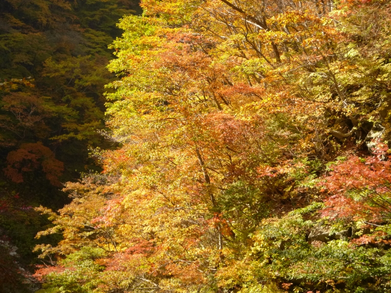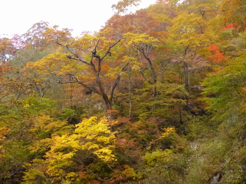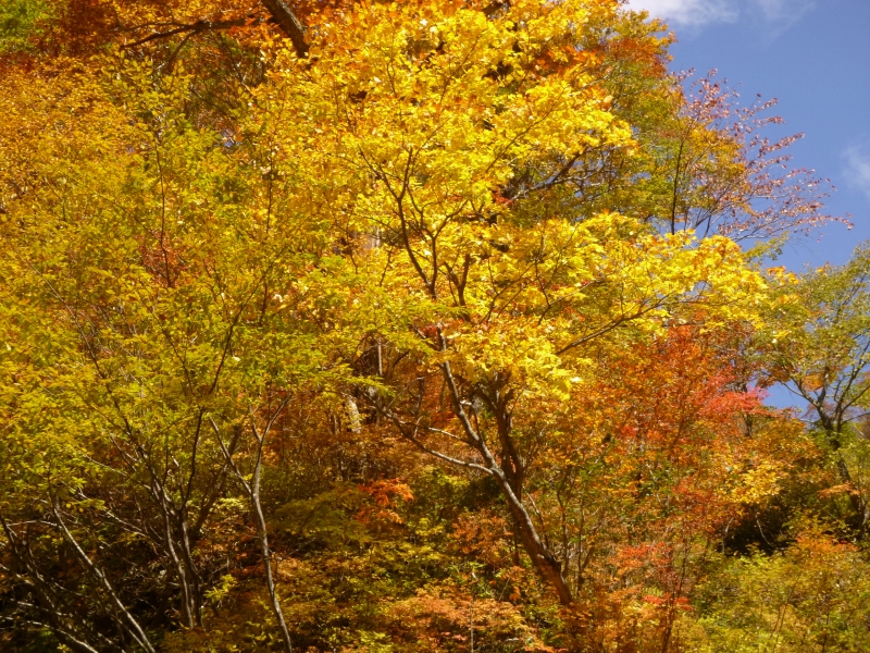 登山道が急降下するようになると左右の山腹の紅葉がすばらしい。陽が傾いて陰ってきているにも関わらず赤や黄やオレンジが輝いて艶やかな色彩を見せている。まさに真っ盛り。思わず目を奪われ立ち止まる。一生懸命カメラに収めるが恐らく感じたようには写ってないだろう。