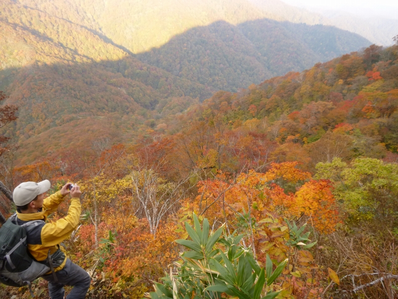 登山道が急降下するようになると左右の山腹の紅葉がすばらしい。陽が傾いて陰ってきているにも関わらず赤や黄やオレンジが輝いて艶やかな色彩を見せている。まさに真っ盛り。思わず目を奪われ立ち止まる。一生懸命カメラに収めるが恐らく感じたようには写ってないだろう。こちらの方は天気が良かったようですね。台高はイマイチだったので、ちょっと後悔入ってました。(^_^;)