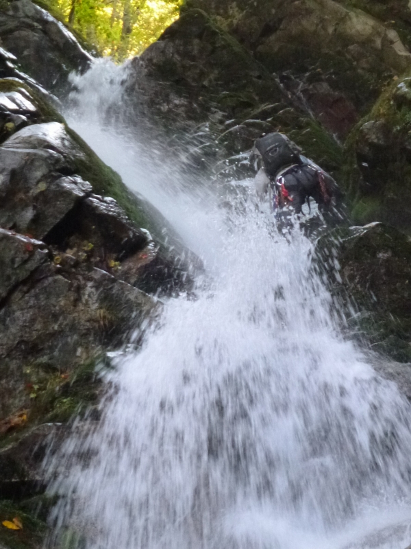 途中水流の方へ追いやられシャワー状態。しばし耐えて上部のテラスに出てからは思ったより簡単に登れた。とっちゃんにはロープを出すつもりだったが最近あまりやってないロープワークにアタフタしているうちに半分位登っていた。 上にも3~4mのシャワー、半シャワーの滝が3つほど。つめた~い、と叫びながらもニコニコ顔のとっちゃん。折角着たカッパの胸元が開いてたらそりゃ冷たい。 しばらくゴーロが続く。左岸に二条の滝を見たその先が一つ目の二俣。谷を埋める紅葉を眺めながら休憩。 右俣に入ってすぐに頭になかった12mほどの大滝が現れた。ボリューム感はあるが水流が細い。全体に苔むしていてふーさんが見たら泣いて喜びそうだ。