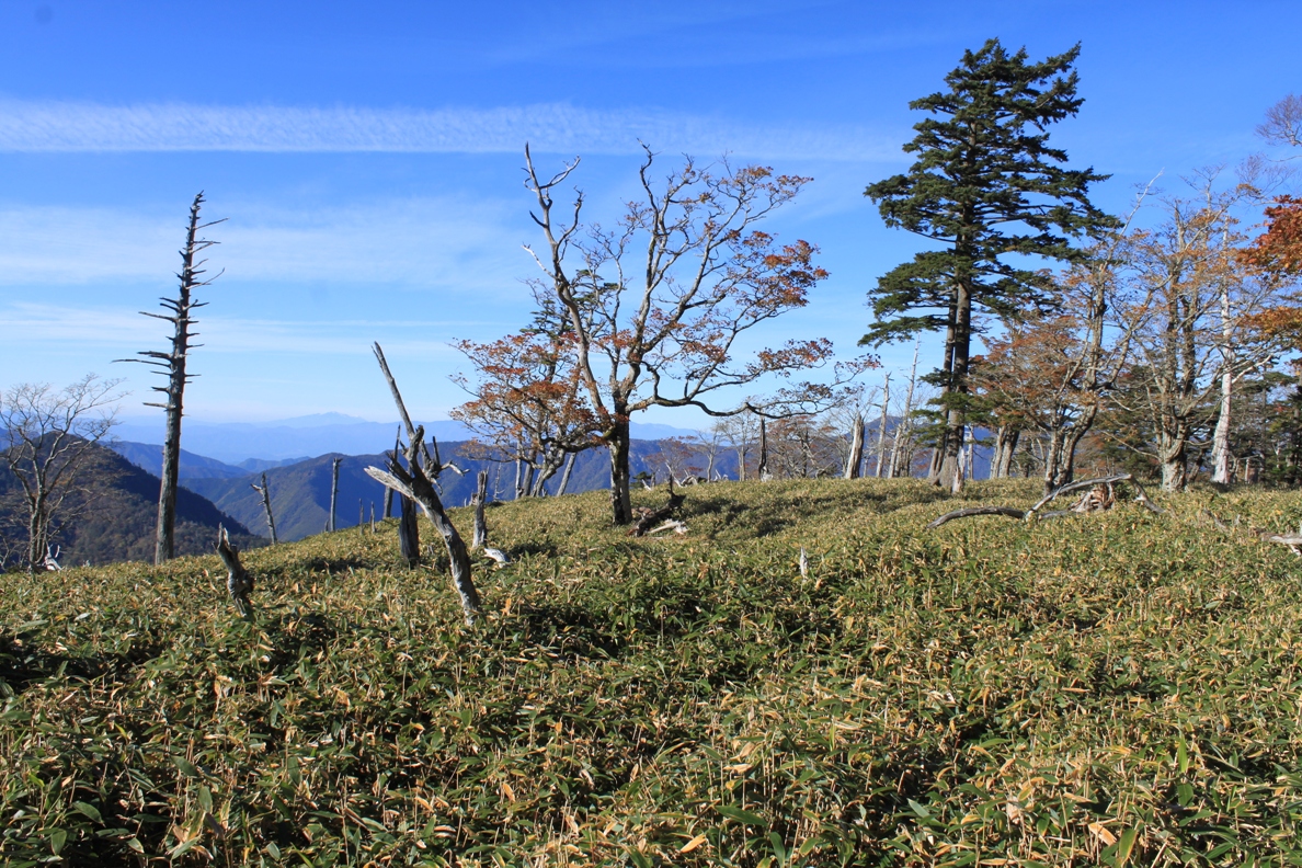 尾根が広がるといよいよ笹原に立ち枯木、風倒木の世界になった。踏み跡は不明瞭なケモノ道の錯綜になり、静かなザ・深南部に突入だ。標高は1700m台で、紅葉はほぼその盛りだった。冷気が吹き抜ける房小山を過ぎ、二重稜線のなか明るい笹原を行く。とにかく気分よく歩けるのだ、疲れるけど。陽が傾くころようやくバラ谷ノ頭が近づいた。笹原の先、はるか南西に太平洋が鈍く西日を浴びているのが見えた。