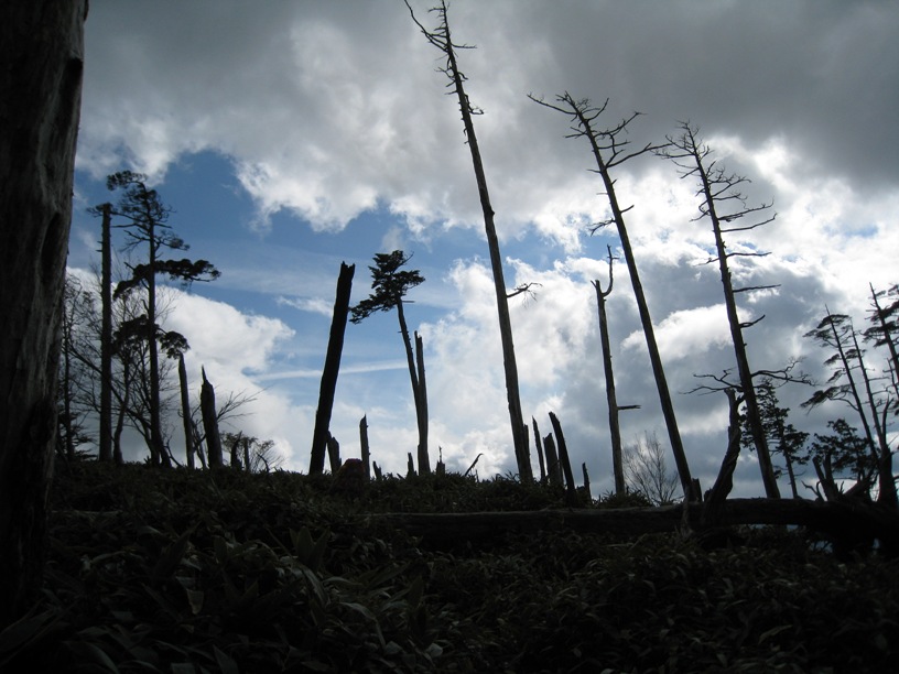 倒木が埋まる小ピークをいくつも越え、尾根が広がったところで幕を張った。ここでは既にだいぶん遠くなった黒法師が、緊張した三角錐をひきしぼり、北には遠く光、茶臼、聖がみえた。暗くなって寝る前に外に出たら、そこは月光の世界で、満月にはまだ5日ほどあったのだが、周りの倒木や立ち枯れを白々と照らしていた。寒かったがまるで夢のような世界で、こんなところで鹿がダンスすればどうだろうと思った。でもなぜかその夜は鹿の鳴き声すらきかなかった。アルコールはすでに切れていた。縦走だからと60度の「どなん」を大量に持ち込んだのだが、初日寸又峡の駐車場でその4割を飲んでしまったのだ。こんな飲み方をして、翌朝平気で歩ける自分がなんだか恐ろしい。この夜は空になったアルコール用ポットに水を入れてシェークして飲んでみた。やっぱりただの水だった。南の方に街の明かりがつながっているのがみえた。