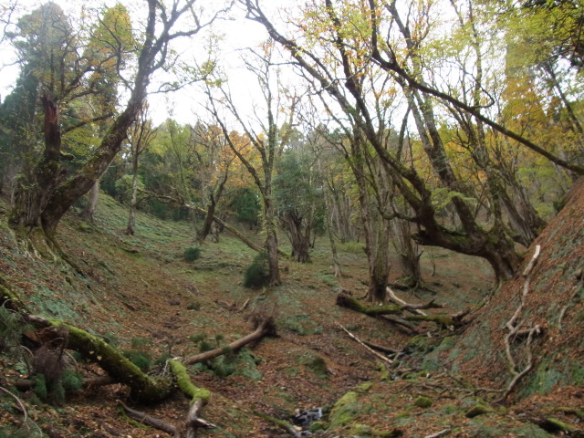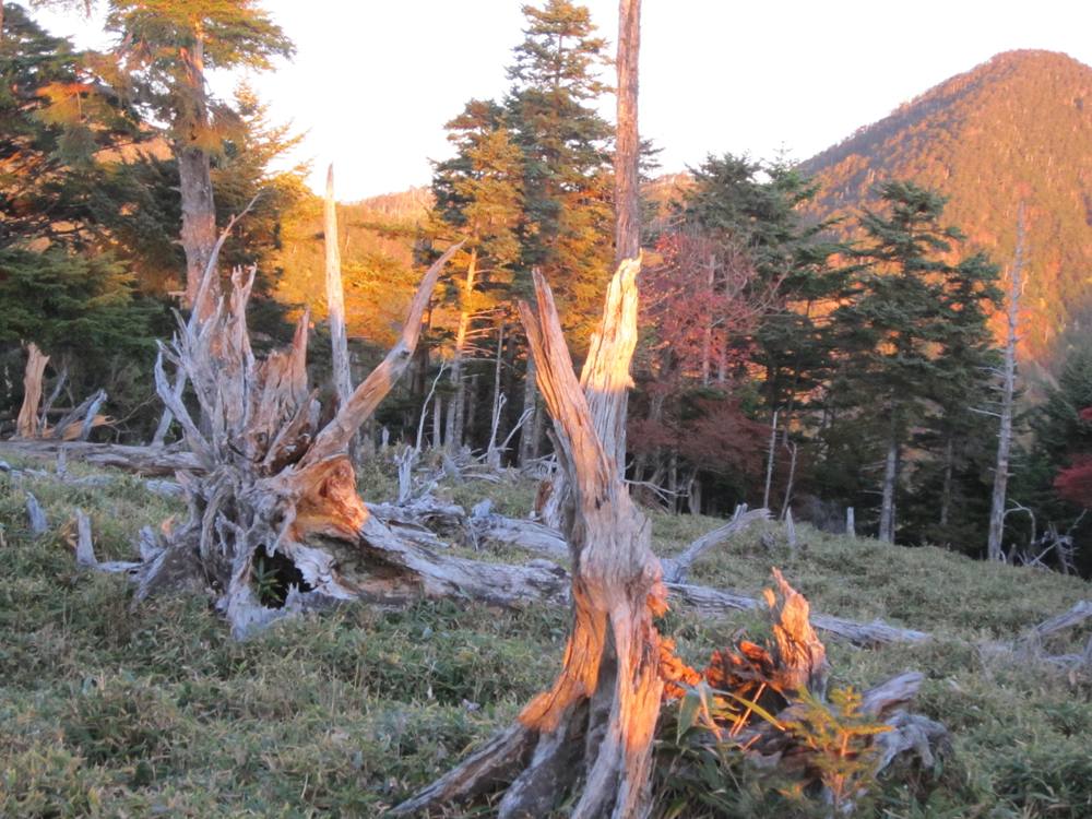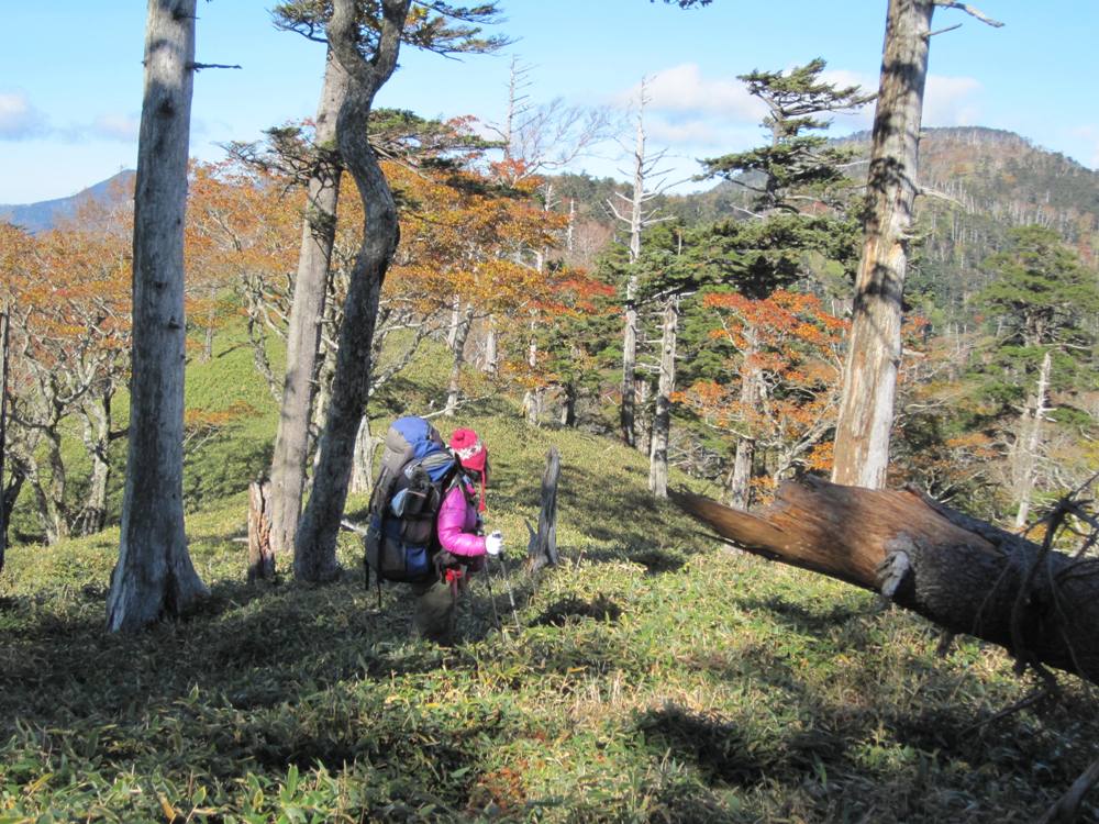 翌朝は寒冷前線が通過した。もちろん停滞。それどころか雷が数時間にわたって鳴り続いた。お昼頃雨は上がったが、今度は吹き返しの北西風が一晩うなり声をあげた。幸い南東のみに開けたテン場の地形が雨風からテントを守ってくれたようだ。さて24日の太陽はその南東から上がった。風もなく、早朝から出発だ。稜線を千石平、鋸山と進み、尾根が広がるといよいよ笹原に立ち枯木、風倒木の世界になった。踏み跡は不明瞭なケモノ道の錯綜になり、静かなザ・深南部に突入だ。標高は1700m台で、紅葉はほぼその盛りだった。冷気が吹き抜ける山犬ノ段を過ぎ、