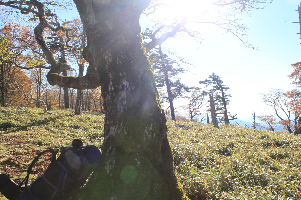 26日の朝になった。快晴だ。ここからもう一つのお楽しみポイント、巨樹点在の広い笹原歩きが始まる。木々は太くねじれ、朝の斜光を浴びて無数の葉が黄金色に輝いている。至福の刻だった。なんだか我慢して声をださないようにしないといけないような気持ちがした。浮かれた声を上げると、この美しい世界がパチンと消えてしまいそうな危うさがあった。