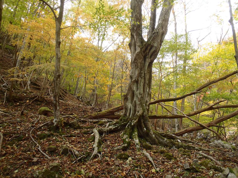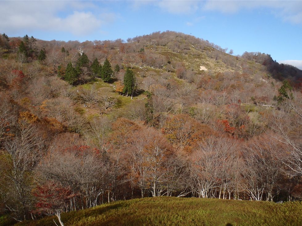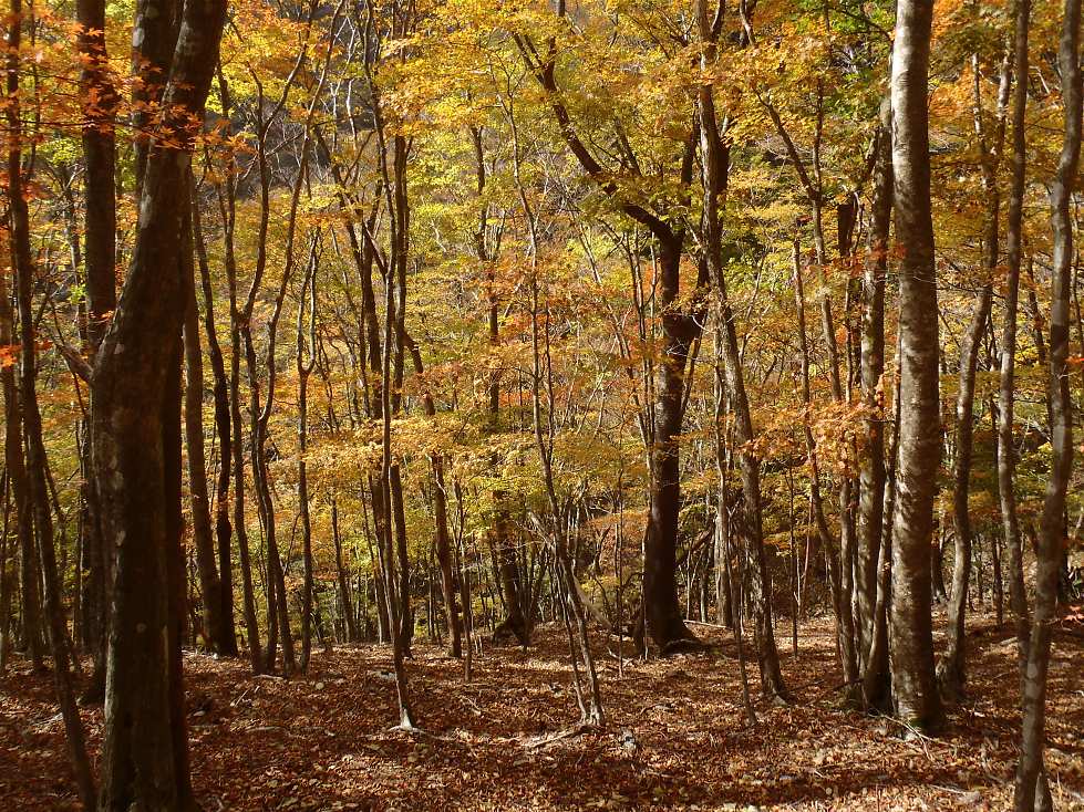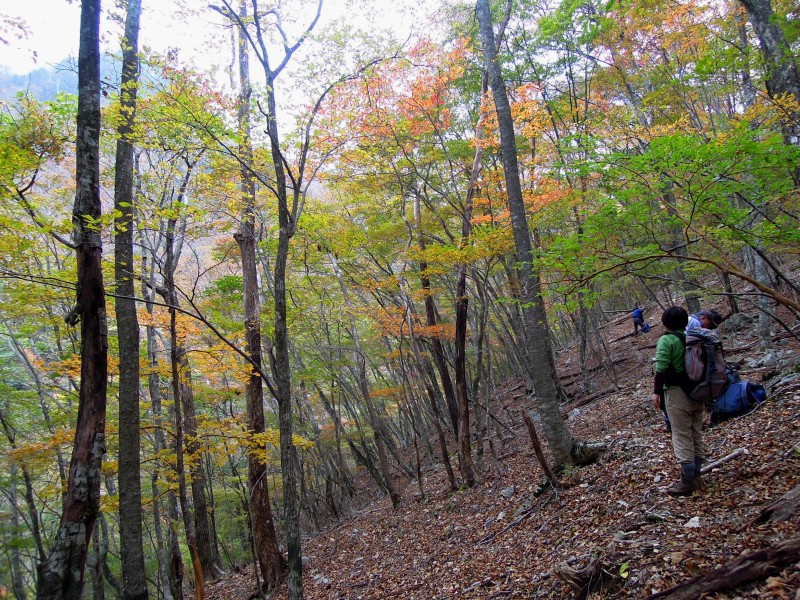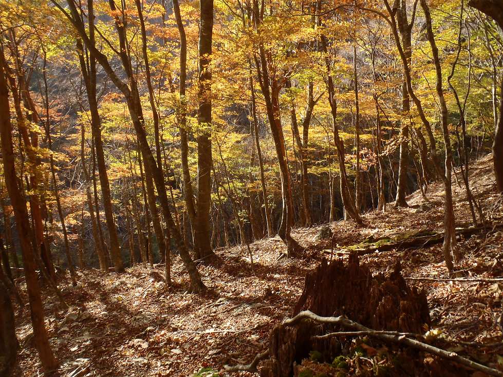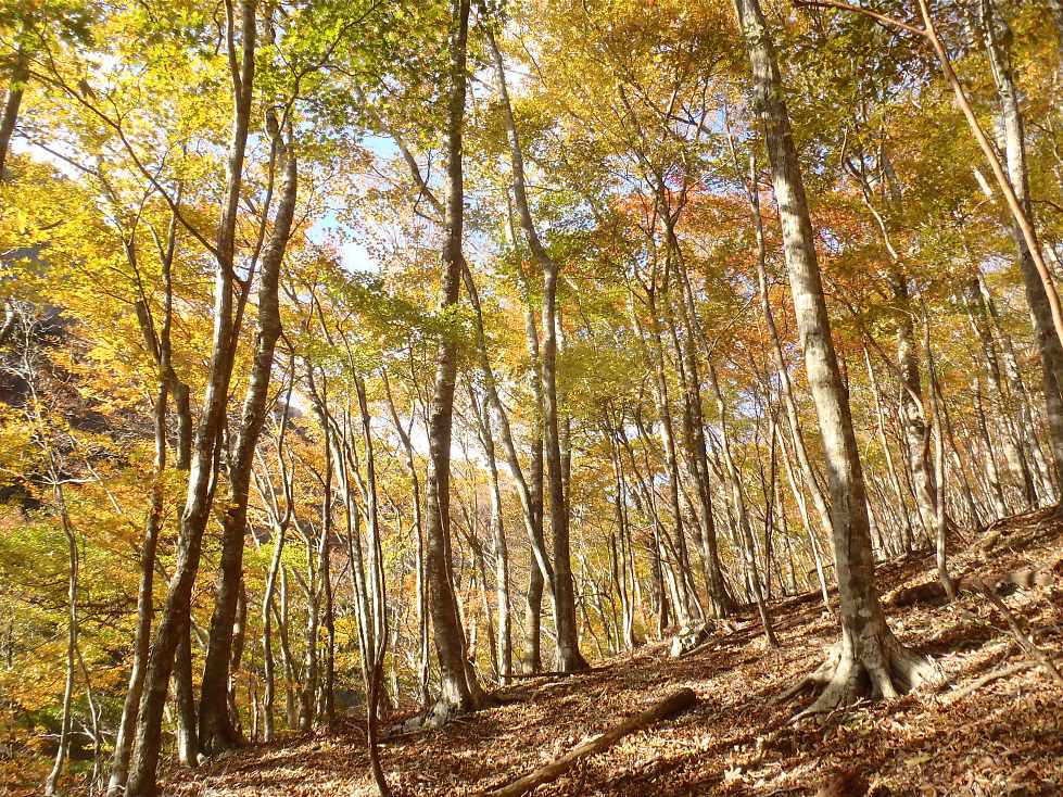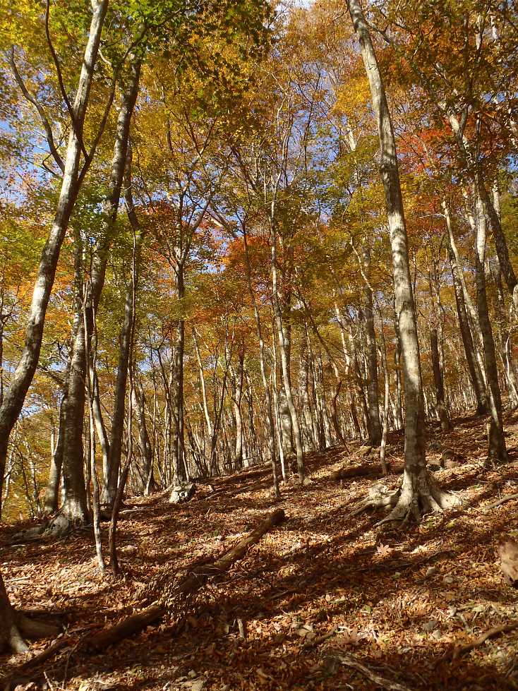 登っていくと予想以上に緩斜面です。ダイラと言ってもいいぐらい。紅葉の森が美しい。尾根巾いっぱいに右へ左へと歩く。
