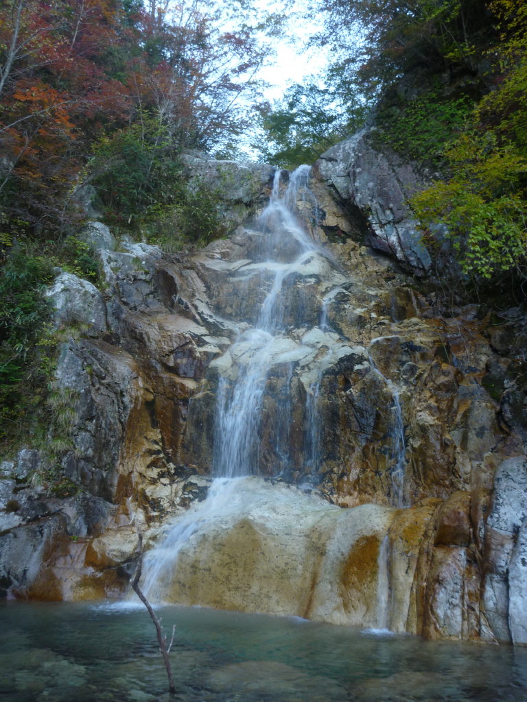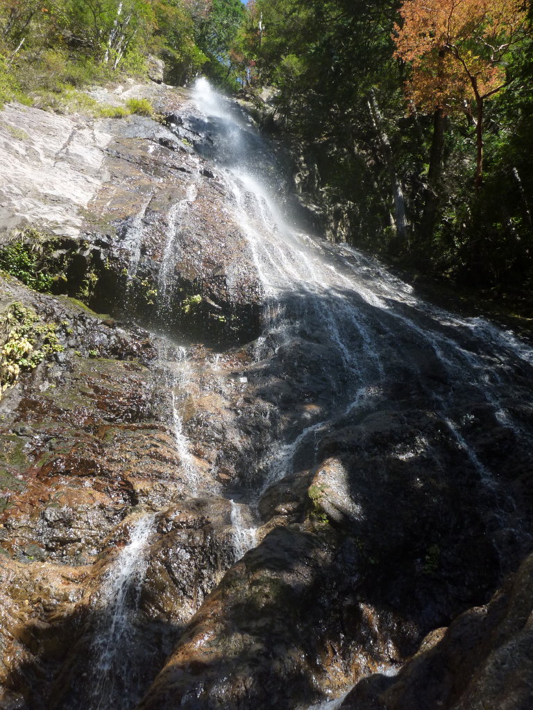 降り立ったのは三重の滝の2段目である千手滝の滝つぼである。40mはあるだろうか、美しい滝だ。足元からは岩を滑るように不
