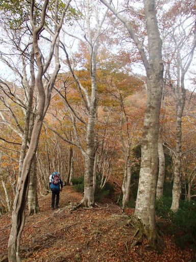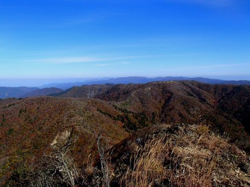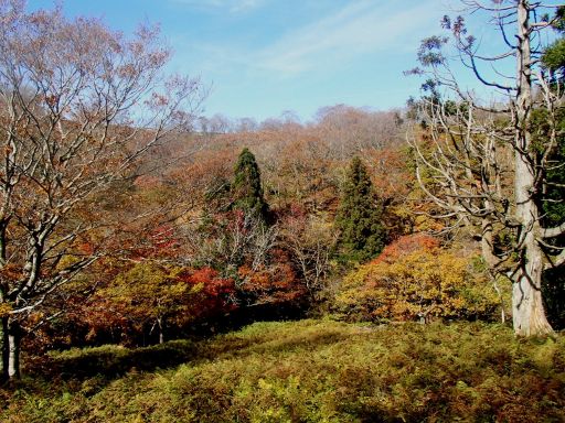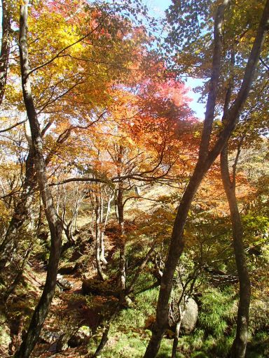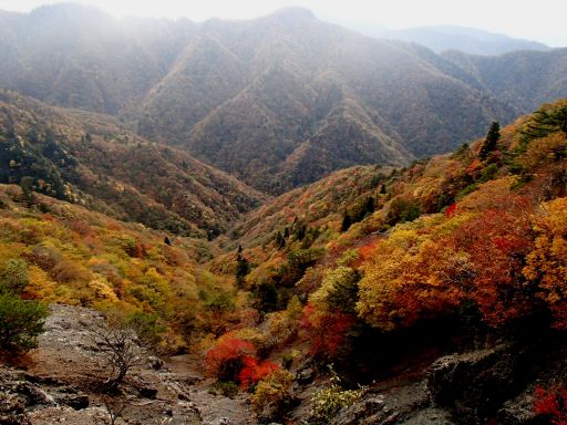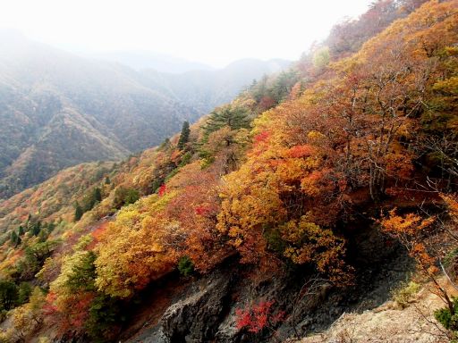 痩せ尾根の崩壊地から見た谷間の紅葉は実に素晴らしかったです。