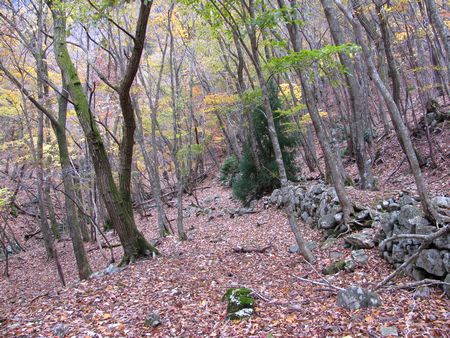 急ぎ足で上流方向へ向かい、オゾ谷に入って、炭焼き窯跡の点在する黄葉した広葉樹林の平地のオゾ谷を進み、最後にザイルが張られた急坂を登るとワサビ峠です。稜線にあがると急に冷たい風が吹き付け、1枚上に羽織って稜線を北上、作ノ峰、小作ノ峰を過ぎてお金峠から東へ下って自然の妙、お金明神と再開した。