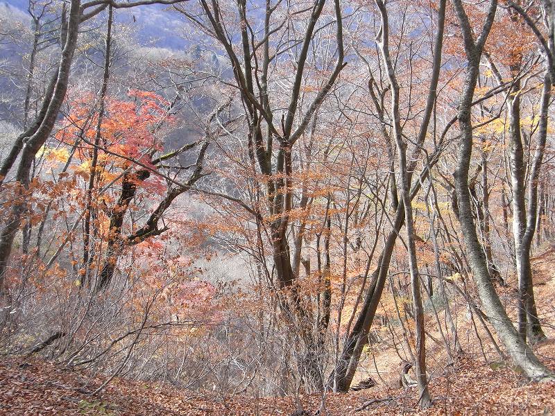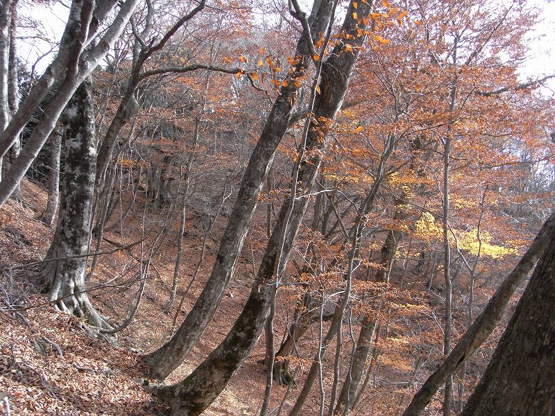 やがて、左側の植林が少し山腹に下がり、尾根は自然林の中を行くようになった。