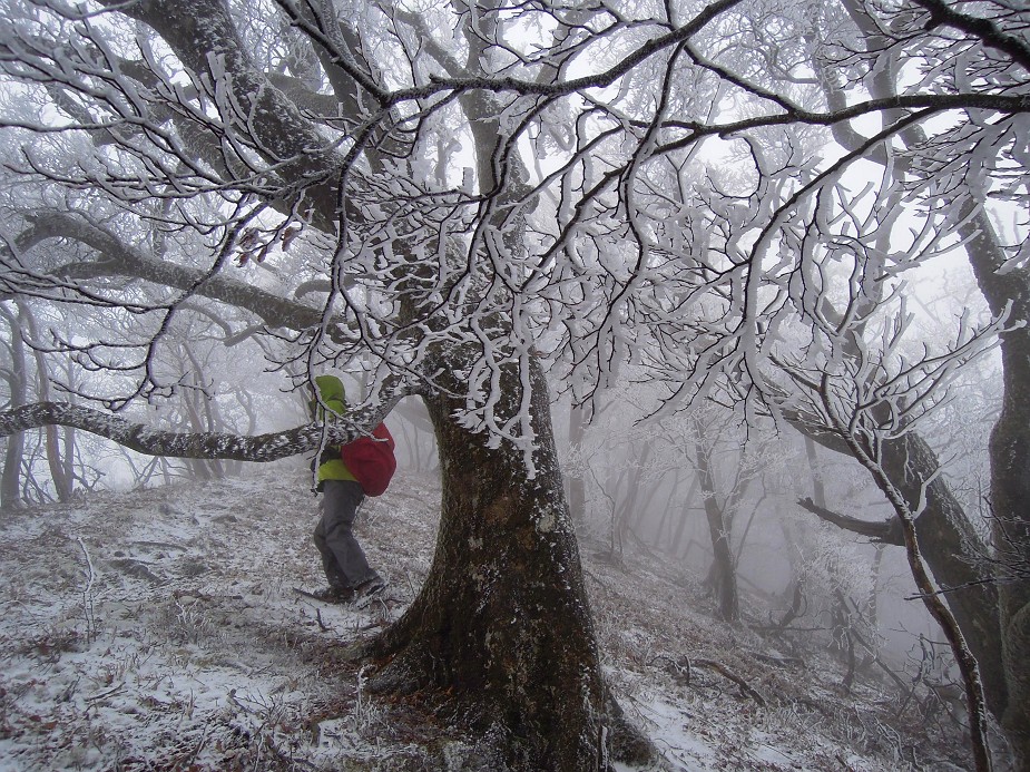 ブナの古木も現れ、登るほどに樹氷が発達していく。大ガレは以前来た時よりも深く浸食されているようだが、ガスでよくは見えない。大きめに巻いて先を進む。