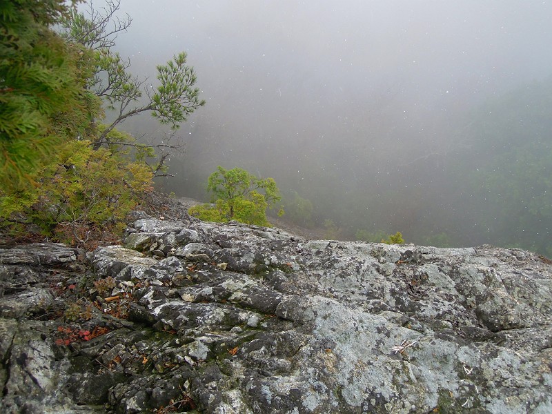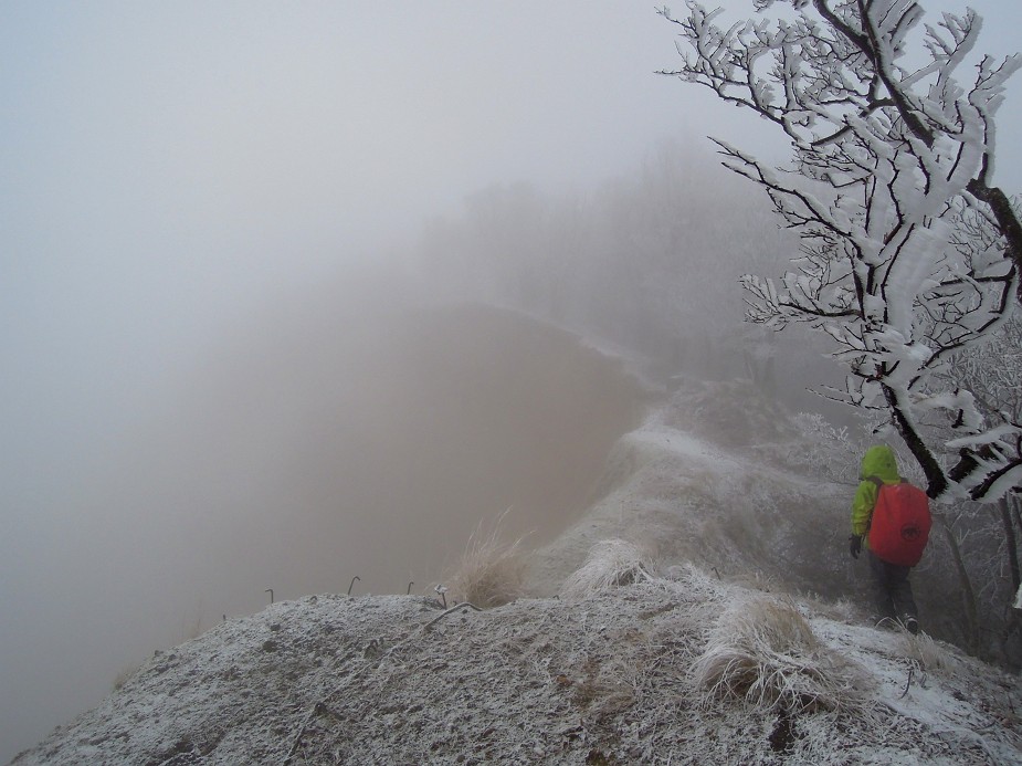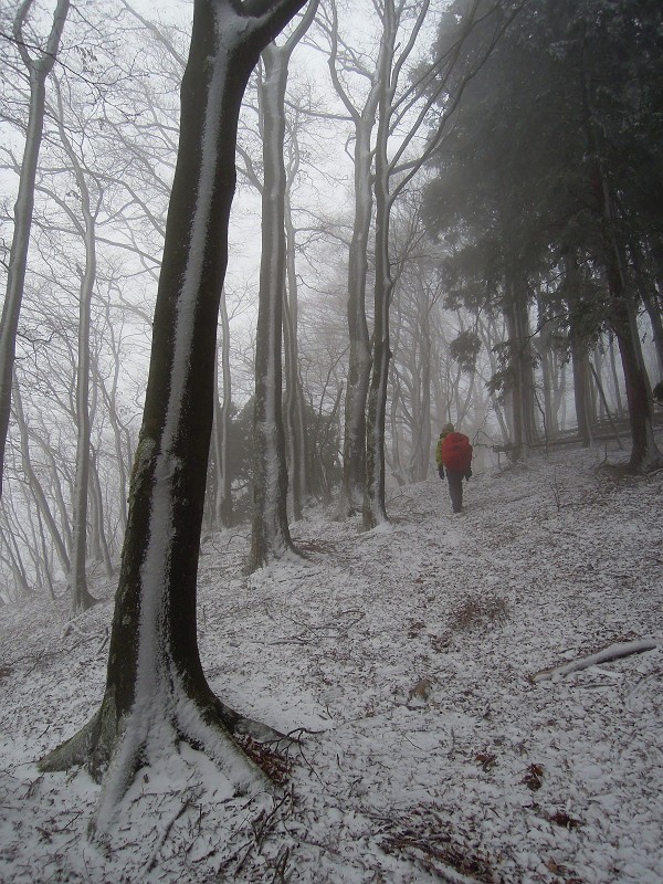黒石山(915.4m三角点)に着く頃には、雪霰が降りだし、周りはガスに覆われてしまった。東吉野側に開けた伐採地を通過するのだが、真っ白で何も見えないばかりか、雪が横殴りで降り注ぎ、右腕右足を濡らしはじめる。まだ先は長いことだしと雨具を着けた。