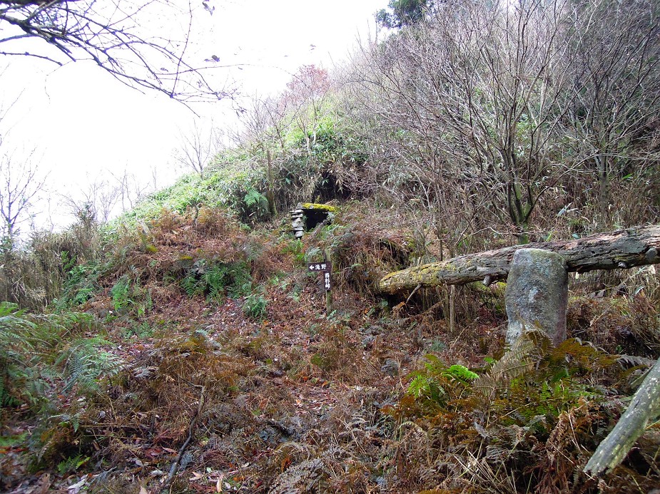 植林を抜け出し、開けた笹&羊歯地に出れば、そこが差杉峠である。ここにはいつの時代のものだろうか?役行者の祠に石柱が残っている。