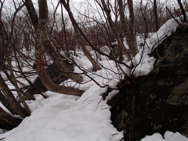 雨を含んだ重い雪質に助けられ大した事ない積雪から突き出す藪を利用すると、超急斜面の登りもトラバースも不安は全く感じ無かった。