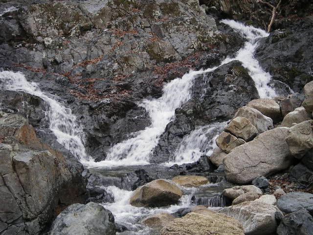 今度は上水晶谷右岸を遡って国見峠を目指す。上水晶谷は緩やかな谷で大きな滝は無い。三条に分かれた滝が一番目立つ程度だ。