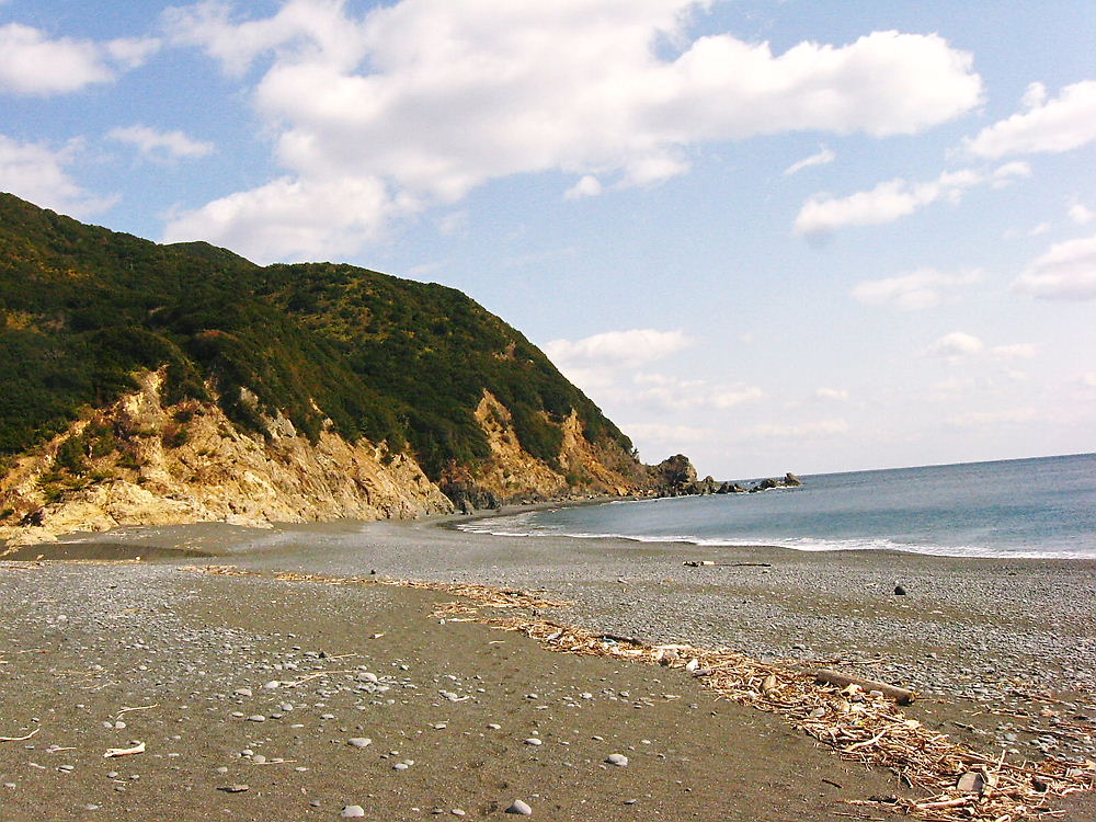 しじらみ浜の標識で一度浜にも寄っていこうと下ってみた。海ベリは打ち上げられたゴミでいっぱいだ、沖の岩には釣り人が乗っている。岩に付いているのはハマギクだろう、今は咲いてないので残念だ。降りた道を戻るのも面倒なんで浜を進み登れそうな所を上がると例に漏れず崖に沿って道が付いている今は使われてないようだが登っていくと元の道に合流した。崖の上から今から向かう志戸の鼻が見えている。