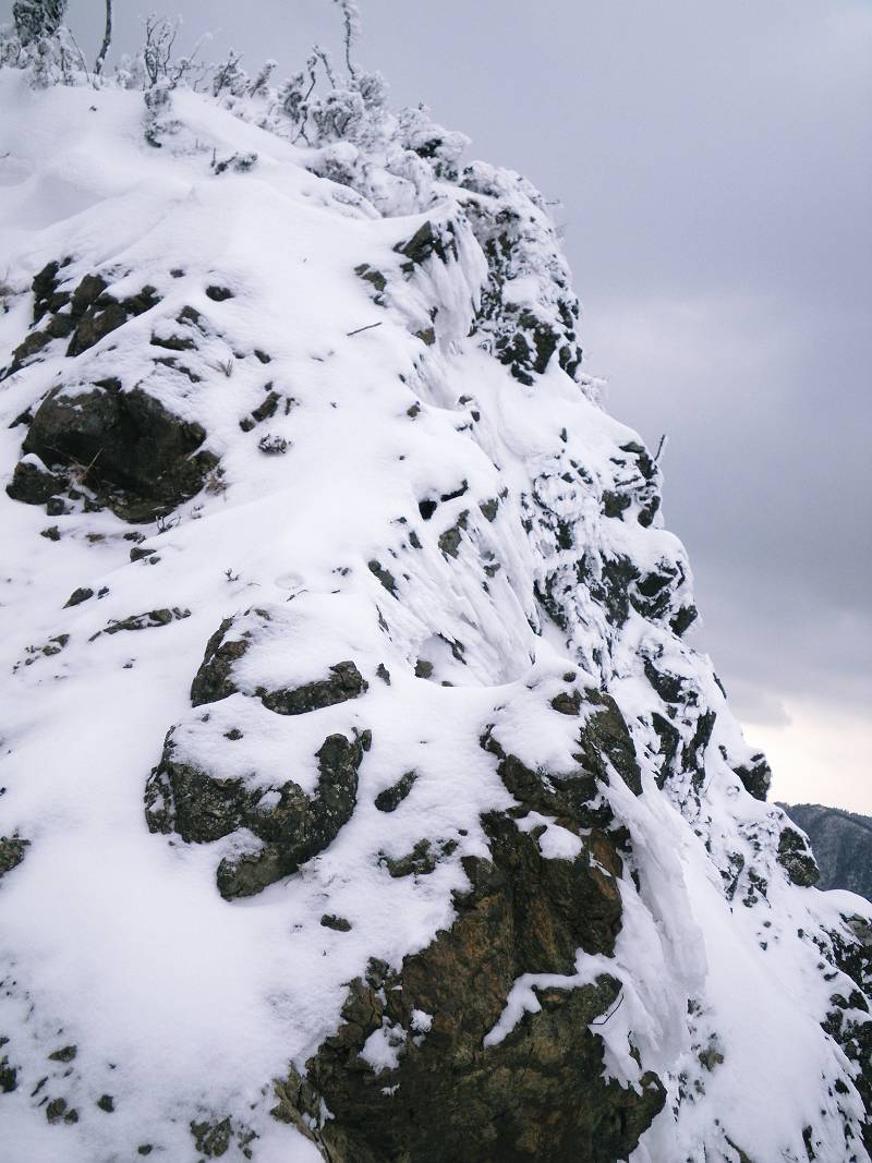 左側は残雪を被った谷筋。正面に急過ぎて雪のつかない岩壁。