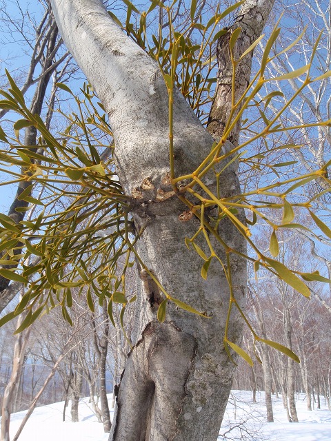 すぐ平坦な尾根になり、これでは下っているのかどうか不安になるほど。老若のブナが立ち並ぶが、ヤドリギが蔓延(はびこ)っているのが気になる。ヤドリギというのは下からツルで巻きついているのかと思っていたが、よく見るとブナの幹や枝のコブのところへからみつくように寄生している。まるで動物に癒着する寄生虫みたいで、なんだかブナが可哀そうになる。しかも、ヤドリギに取り付かれた老ブナは枯れかけているものが多い。何年か後にはこのブナ尾根も様相が大きく変わってしまうのだろうか?