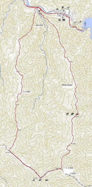 【 ルート 】広野浄水場7:10-手倉山10:10-11:10JCTピーク(昼食)12:10-12:30上谷山12:50-・1082標高点13:30-広谷川左岸尾根-co640-15:45広野