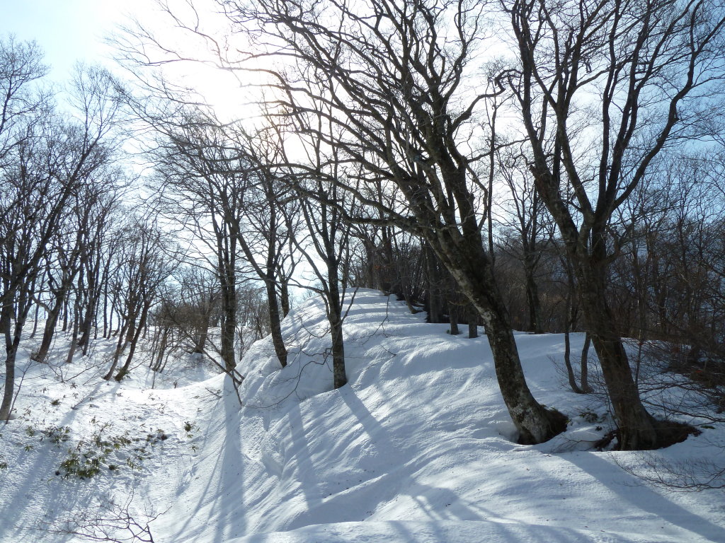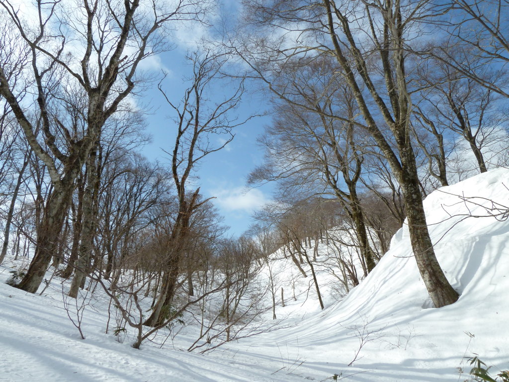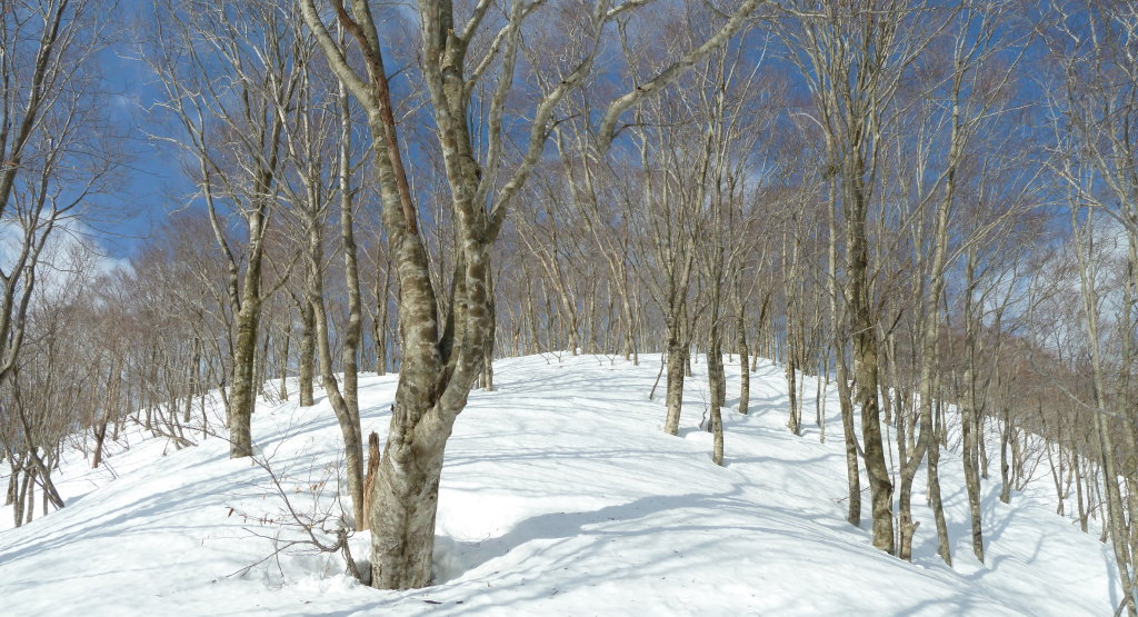 ジャンクション下の小台地のブナ林の雪面に伸びた影が美しい。ここからが逆落としの下りだ。