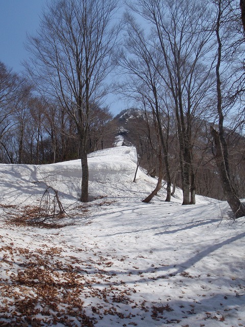 そしていよいよ山頂への急登に入った。単に急なだけではなく、無雪期は強烈なヤブで道はほとんど左斜面を巻いて