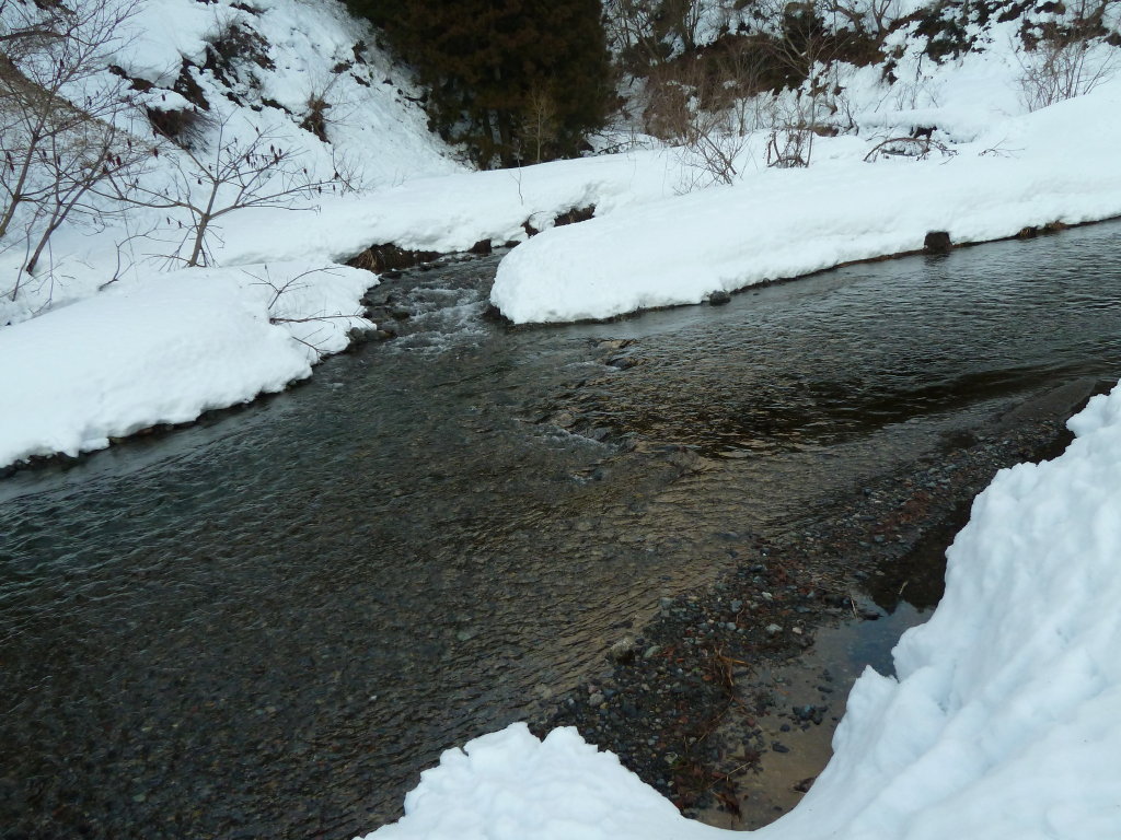 雪原となった河原を横切り、西俣谷の合流点付近で渡渉点を探る。水量は少なく、足首程度の潜りで浸水することも
