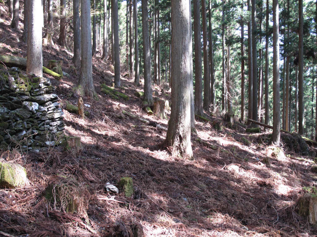 発電所の近くで道を聞いたところ林道の途中から「旧道」と呼ばれる杣道が続いているようなので、杣道を歩く。しばらく上ると屋敷跡があらわれる。これは、元禄のころから続いた南伝八郎の屋敷跡になる。その後、杣道は植林の尾根を巻くのだがここで消えてしまう。この尾根の上部に石碑があるので、探しに行く。岩場はあるのだが、結局わからずじまいで中栃村の中で一番規模の大きい八幡谷と関所谷沿いの集落跡に向けて尾根を下って行く。